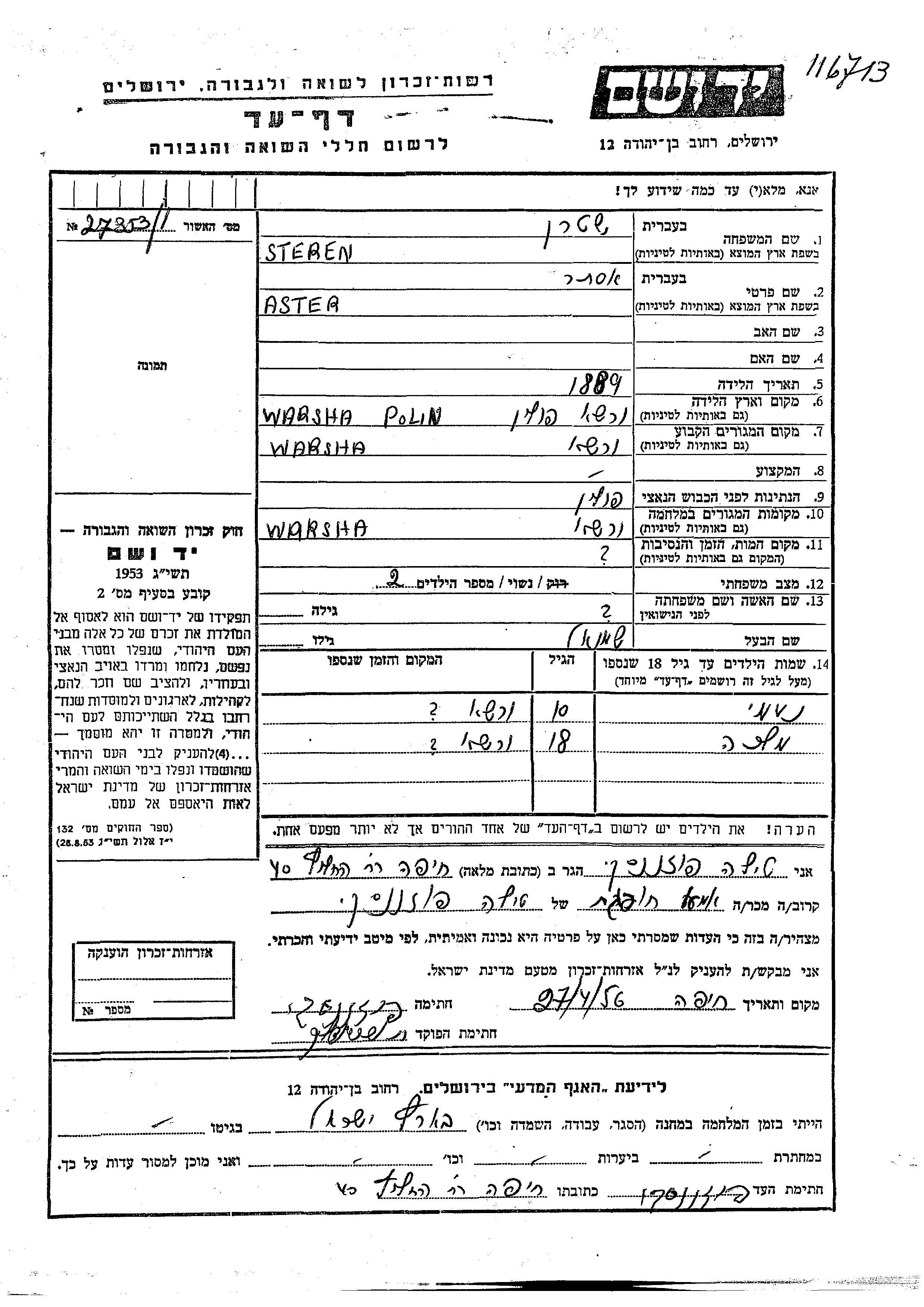 Steren Ester 1889 Warsaw, Poland Page of Testimony
