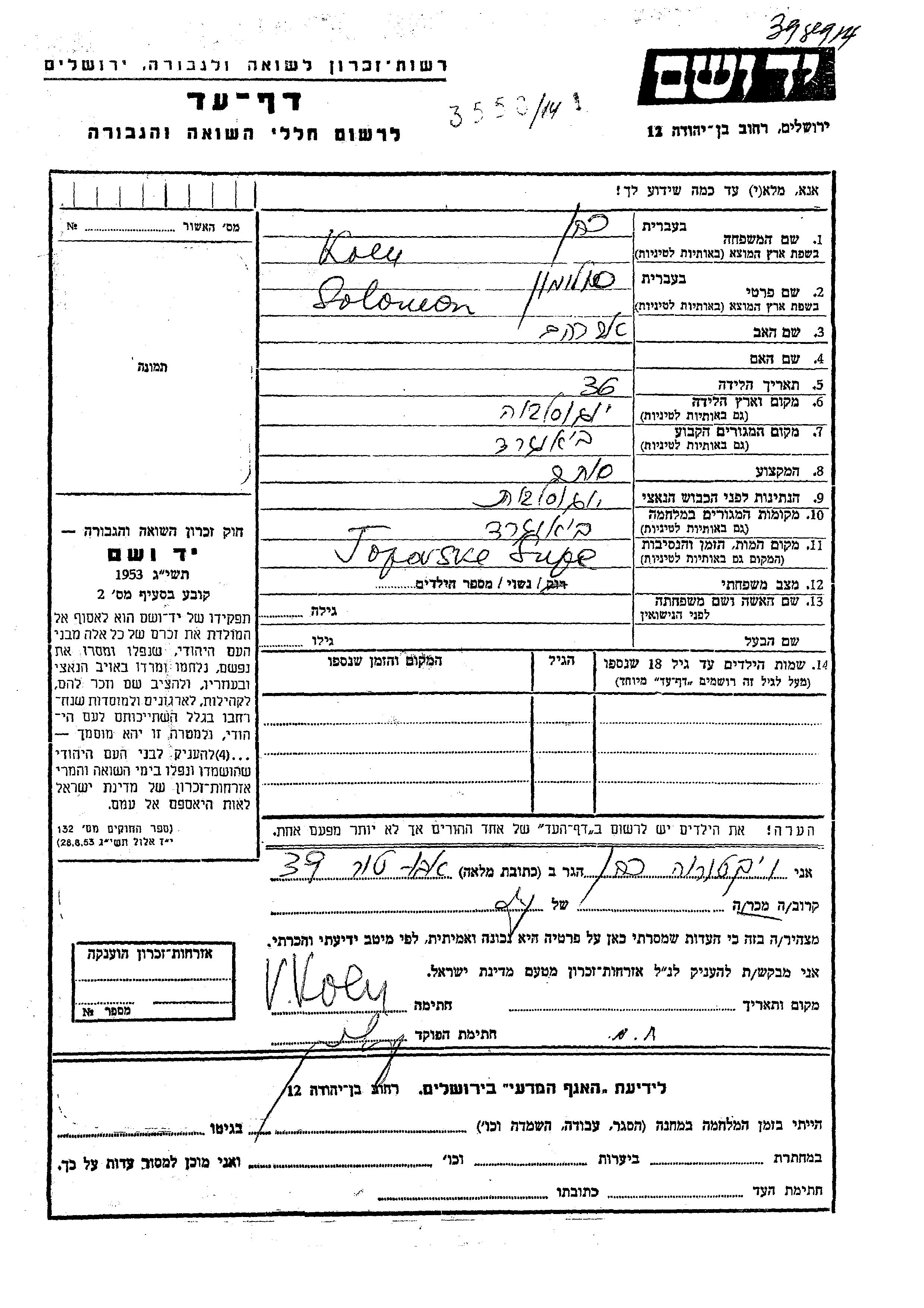 Kohen Solomon Beograd, Yugoslavia Page of Testimony