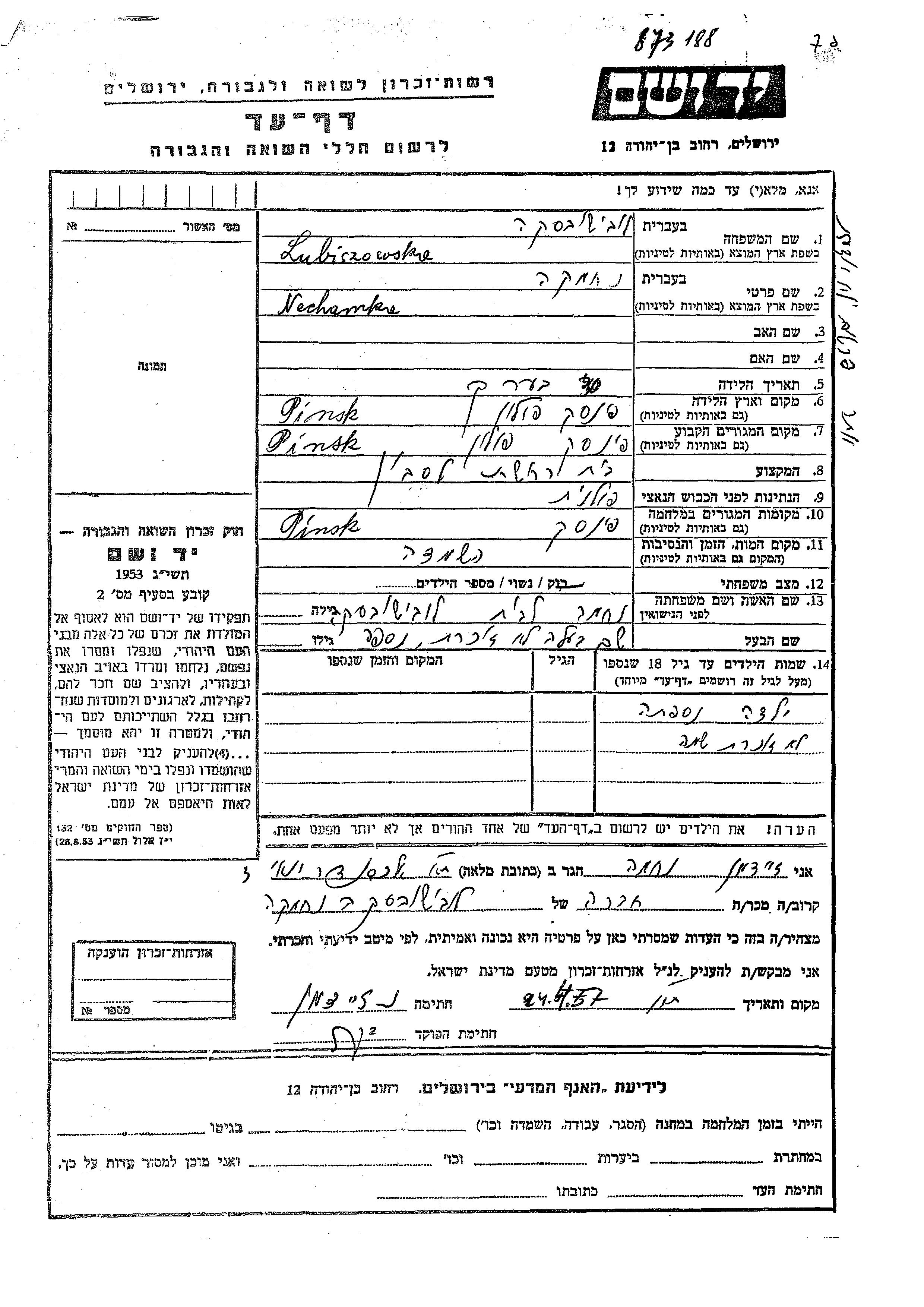Nechamka Lubiszowska nee Lubiszowska was born in Pinsk, Poland. She was married. Prior to WWII she lived in Pinsk, Poland. During the war she was in Pinsk, Poland. Nechamka was murdered in the Shoah.