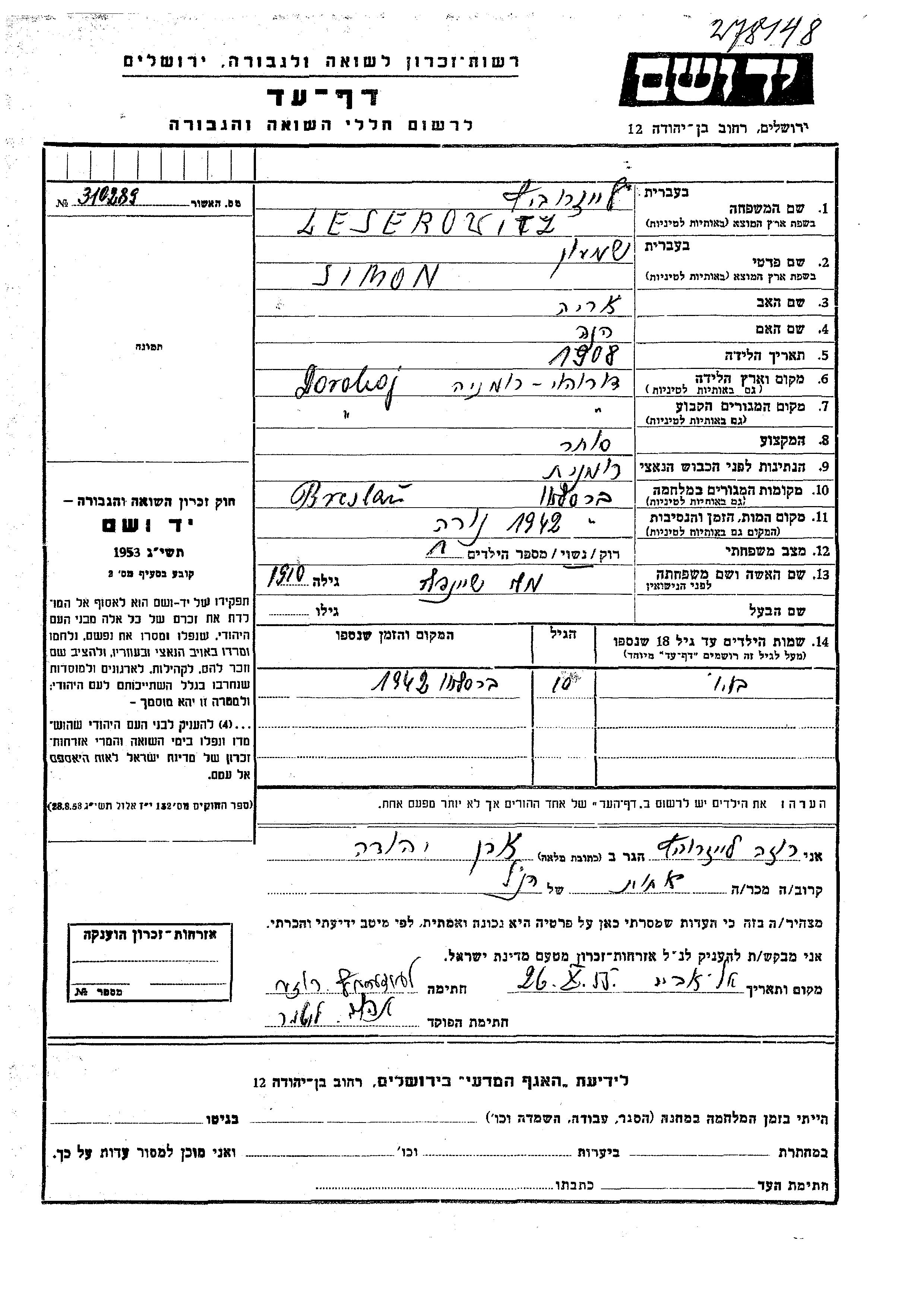 Leizerovitz Shimon 1908 Breslav, Poland Page of Testimony