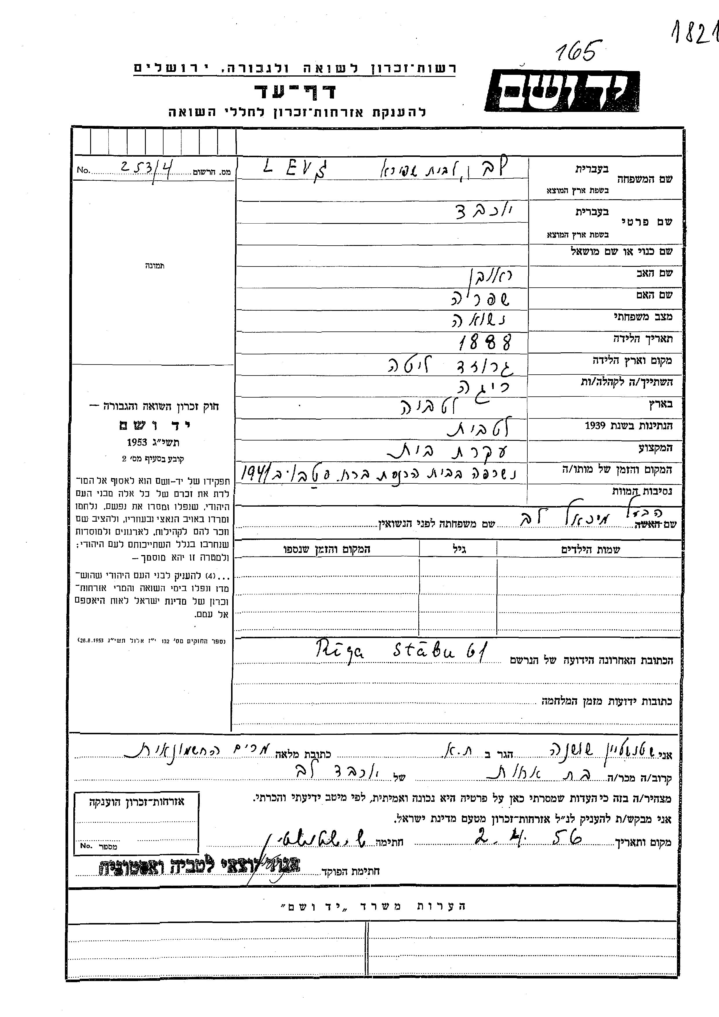 Yokheved Lev nee Shapira was born in Gruzd, Lithuania, 1888 to Reuven and Shifra. She was a housewife and married to Mikhael. Prior to WWII she lived in Riga, Latvia. During the war she was in Riga, Latvia. Yokheved was murdered in the Shoah. Place of death: Riga, Latvia, 1941.