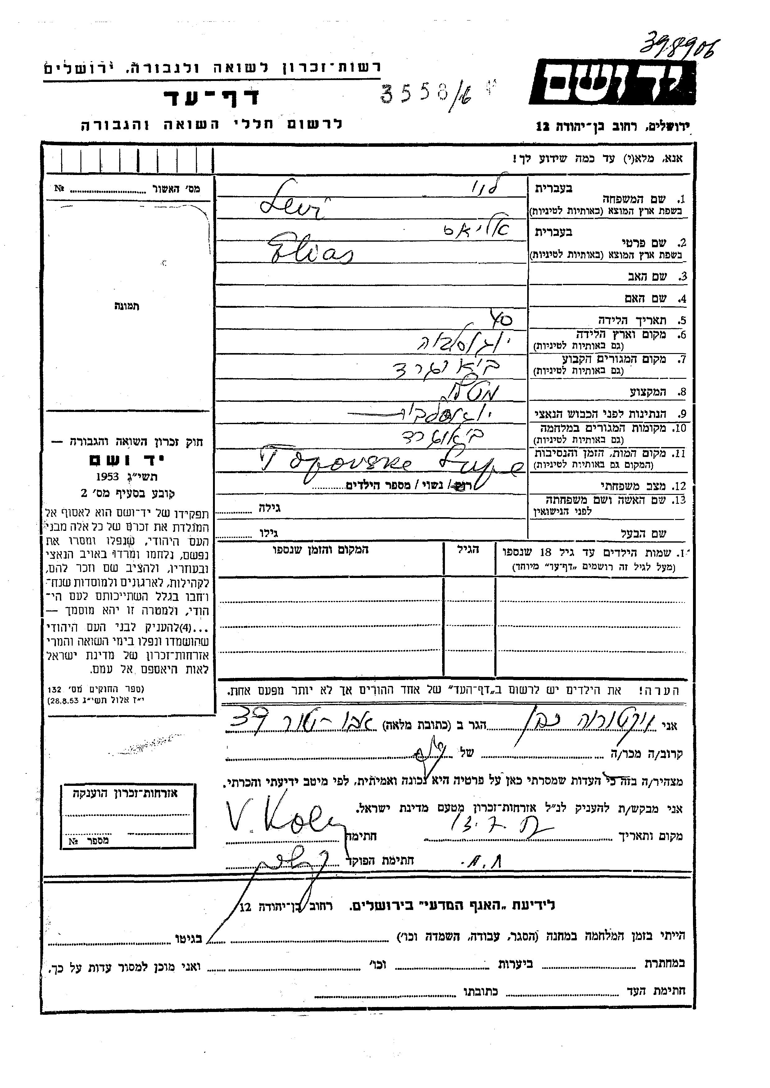Levi Elias Beograd, Yugoslavia Page of Testimony