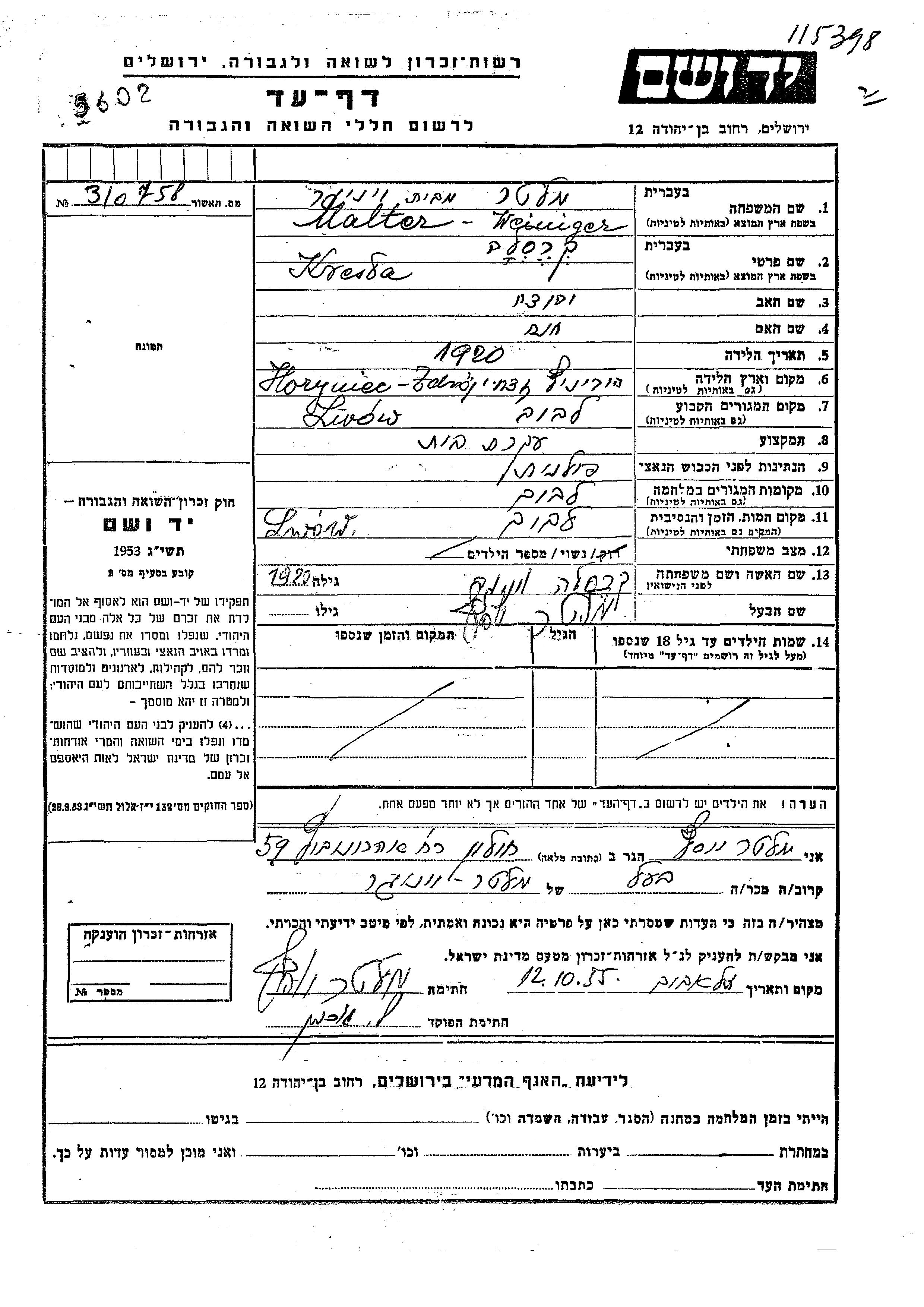 Kresla Malter nee Viniger was born in Horyniec Zdroj, Poland, 1920 to Yehuda and Khana. She was a housewife and married to Yosef. Prior to WWII she lived in Lwow, Poland. During the war she was in Lwow, Poland. Kresla was murdered in the Shoah. Place of death: Lwow, Poland.