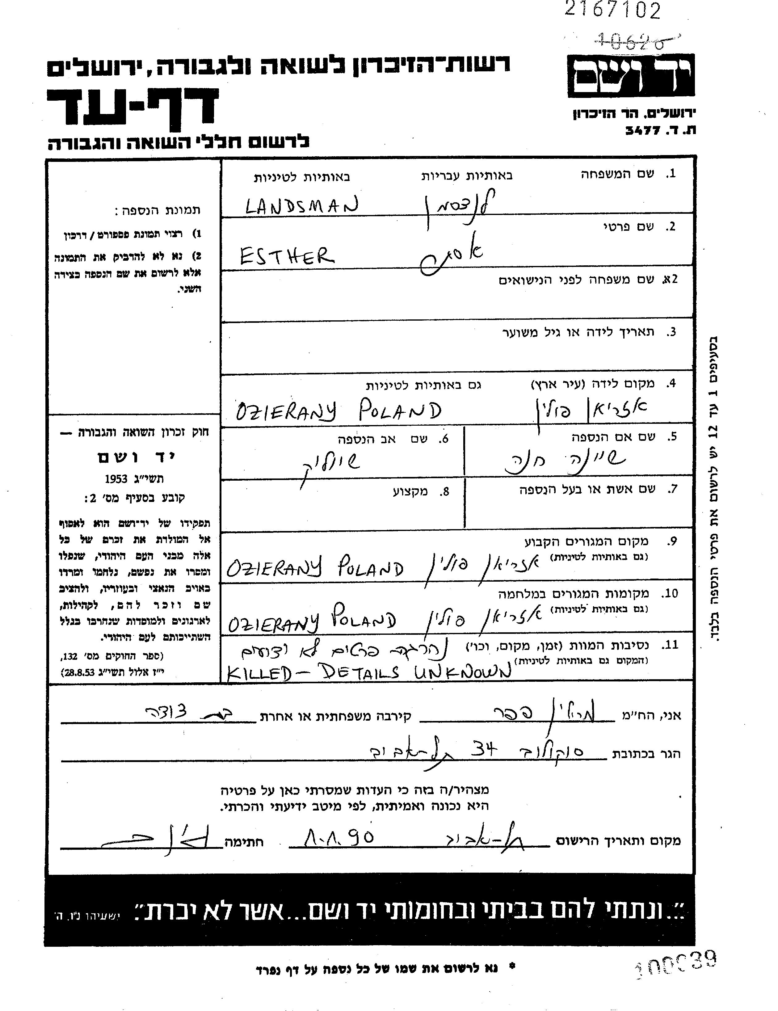 Esther Landsman was born in Ozierany, Poland to Sheylok and Khana Sheina. She was married. Prior to WWII she lived in Ozierany, Poland. During the war she was in Ozierany, Poland. Esther was murdered in the Shoah.