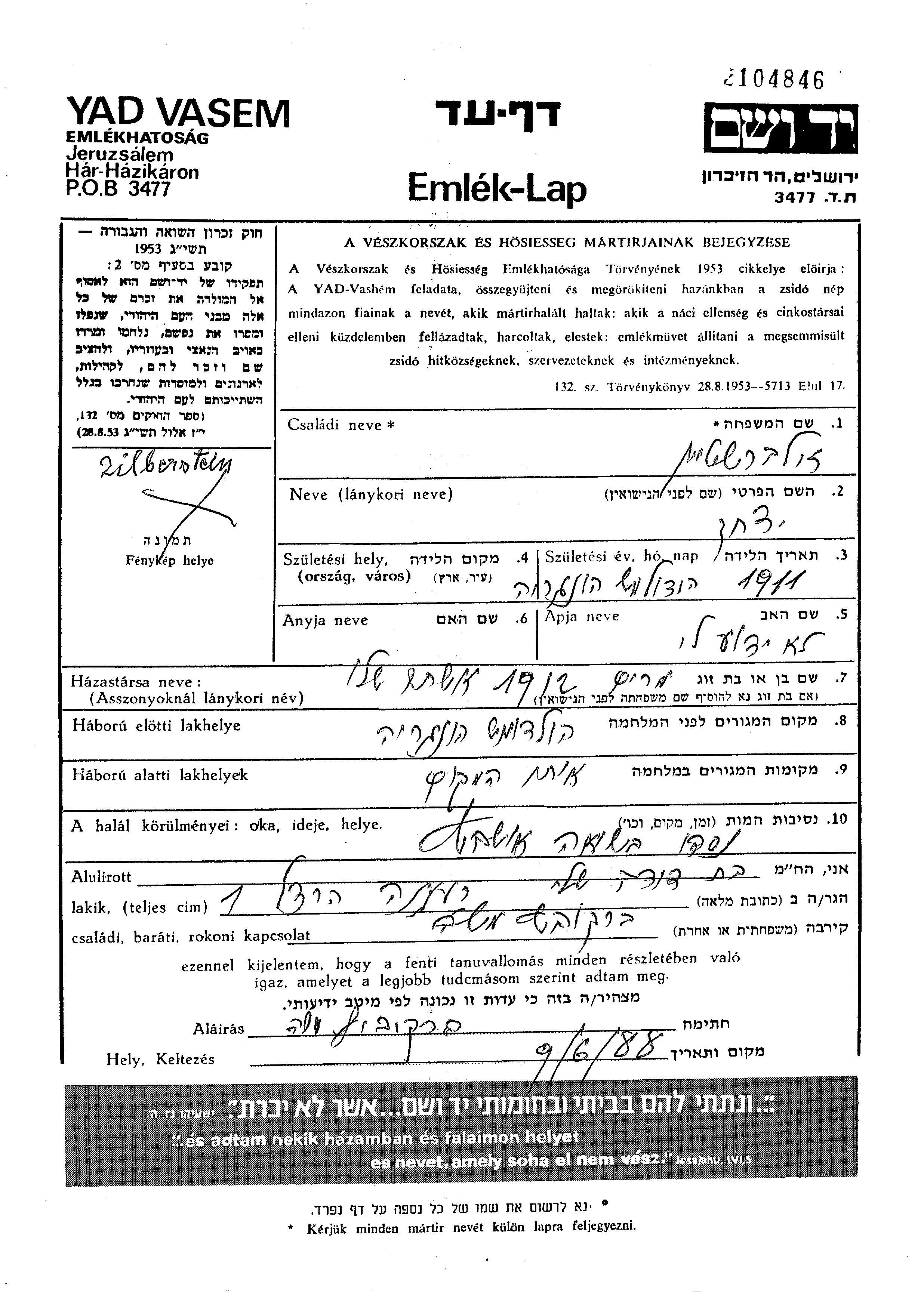 Zilbershtein Yitzkhak 1911 Hidalmas, Romania Page of Testimony