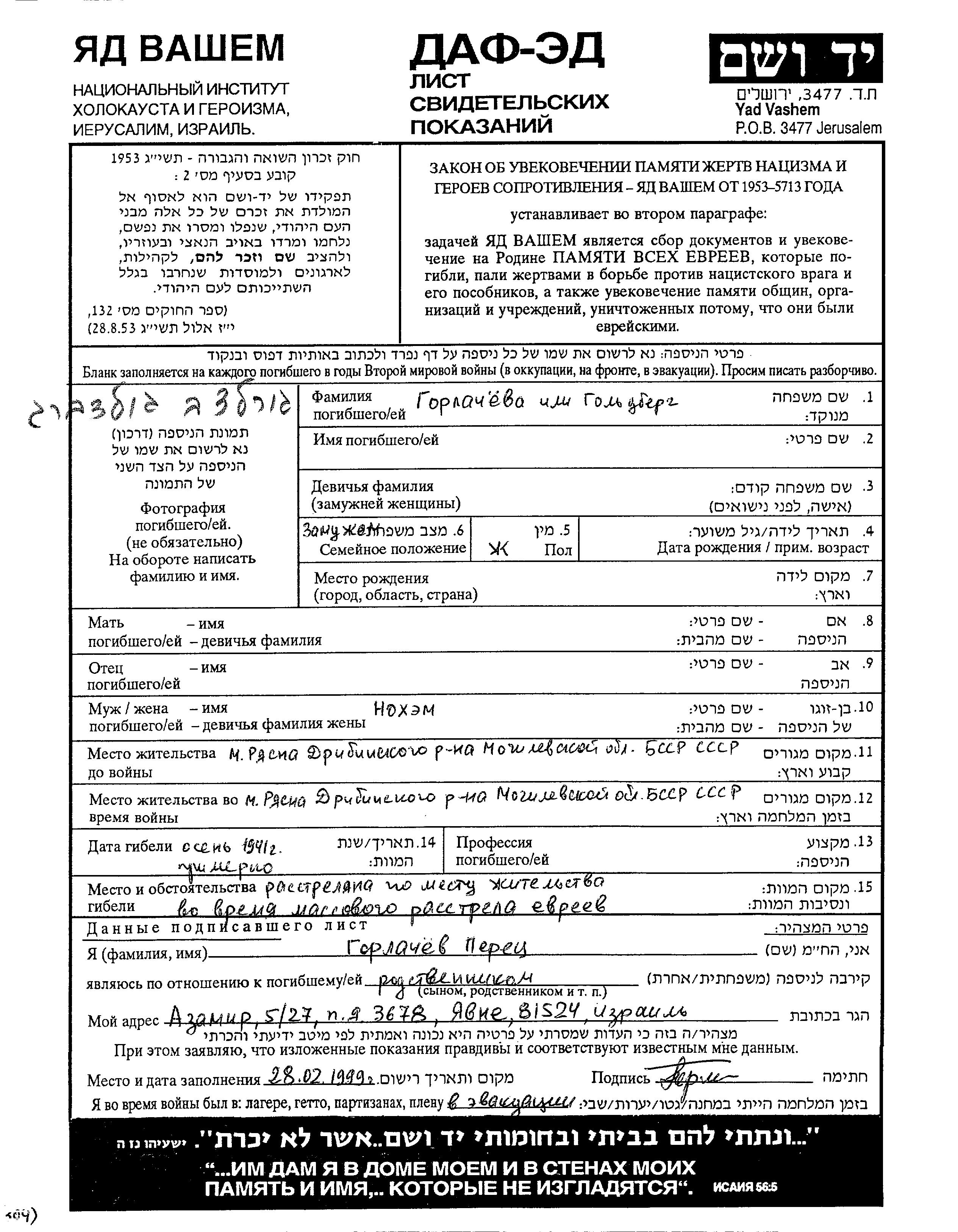 Gorlachova Goldberg Tane Geshe Ryasna, Belorussia (USSR) Page of Testimony