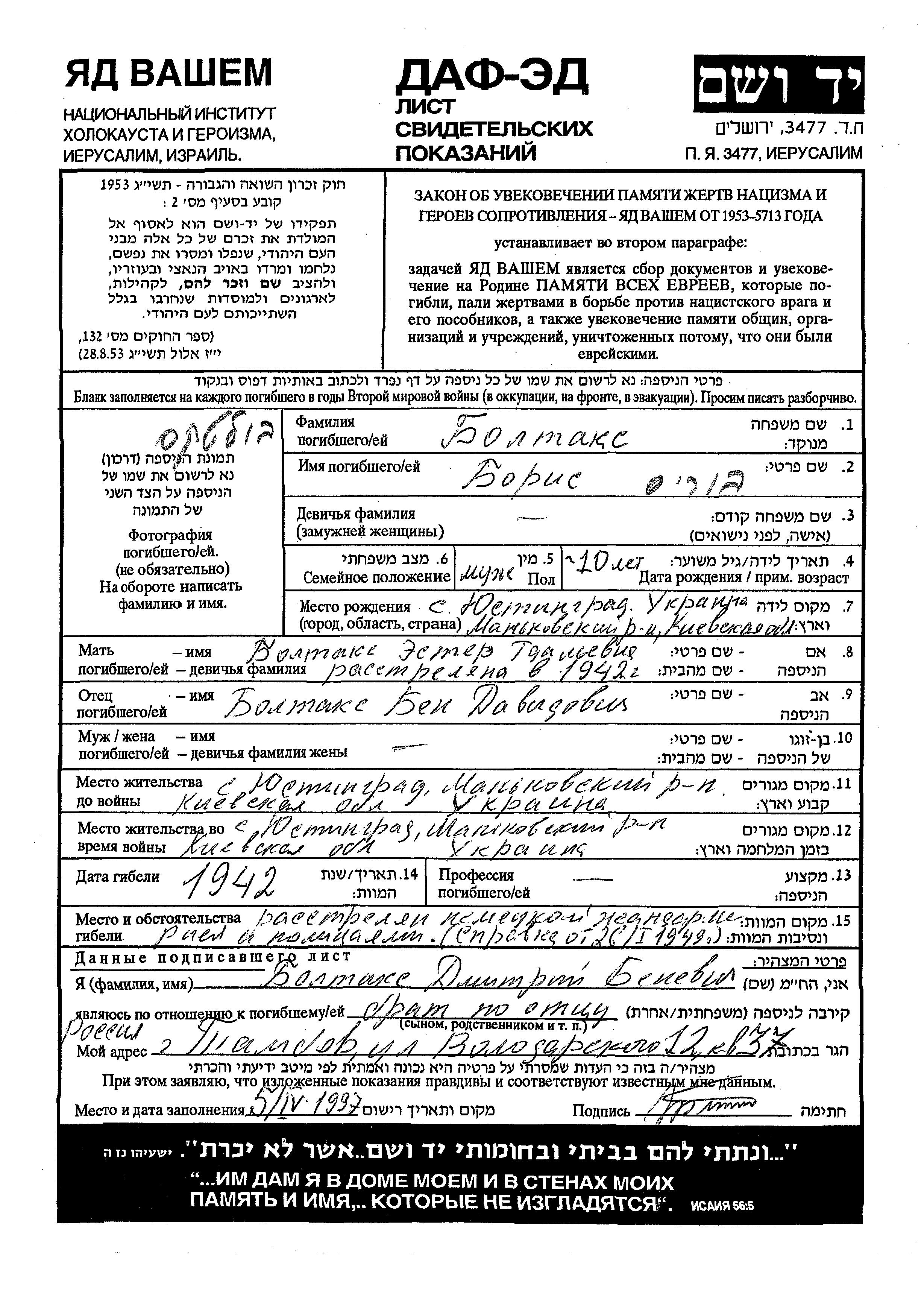 Boris Boltaks was born in Yustingrad, Ukraine (USSR), 1932 to Ben and Ester. He was child. Prior to WWII he lived in Yustingrad, Ukraine (USSR). During the war he was in Yustingrad, Ukraine (USSR). Boris was murdered in the Shoah. Place of death: Yustingrad, Ukraine (USSR), 1942.
