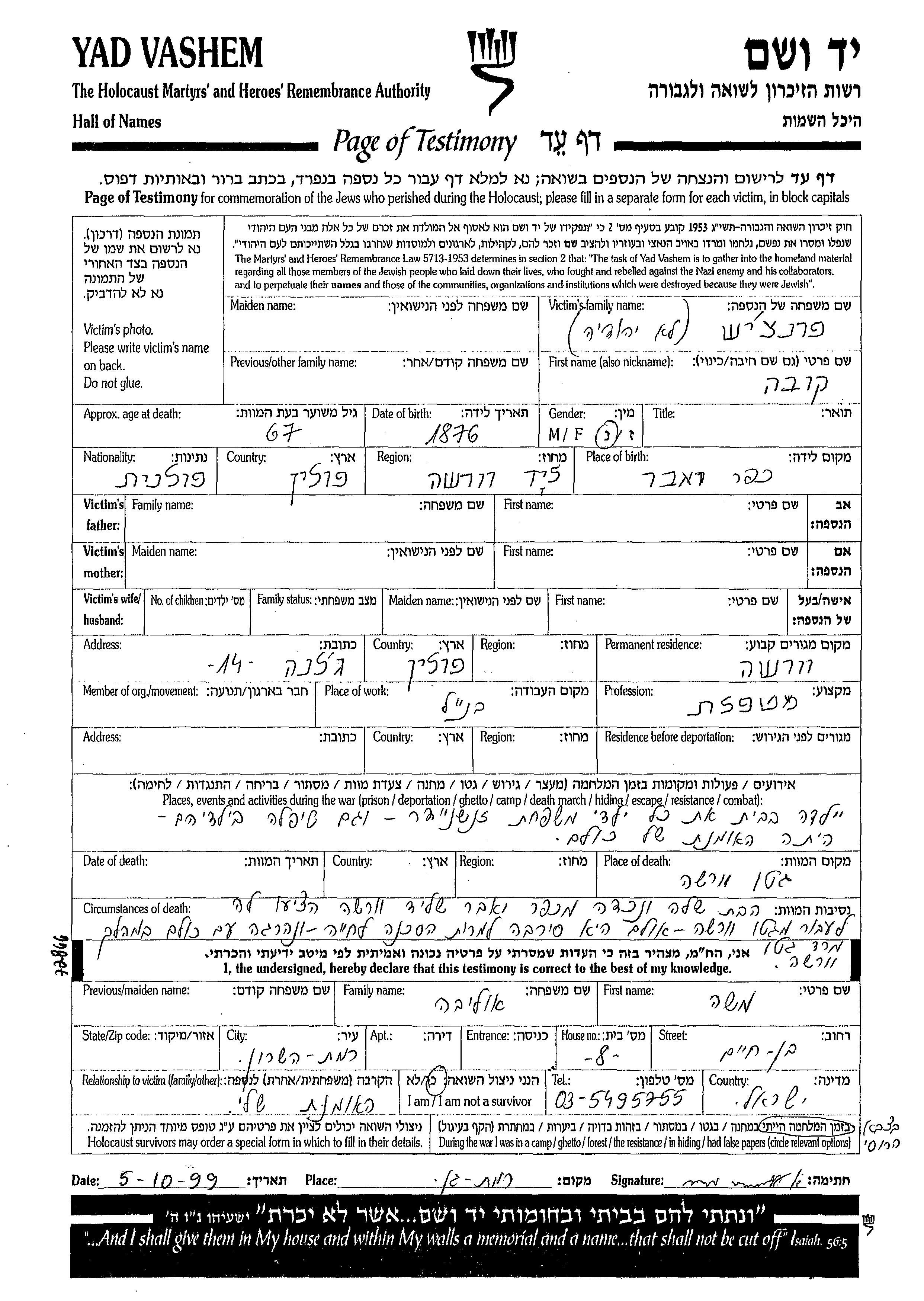 Kuba Frantzes was born in Wawer, Poland, 1876. She was a nanny. Prior to WWII she lived in Varsha, Poland. During the war she was in Warszawa, Poland. Kuba was murdered in the Shoah. Place of death: Warszawa, Poland, 04/1943.