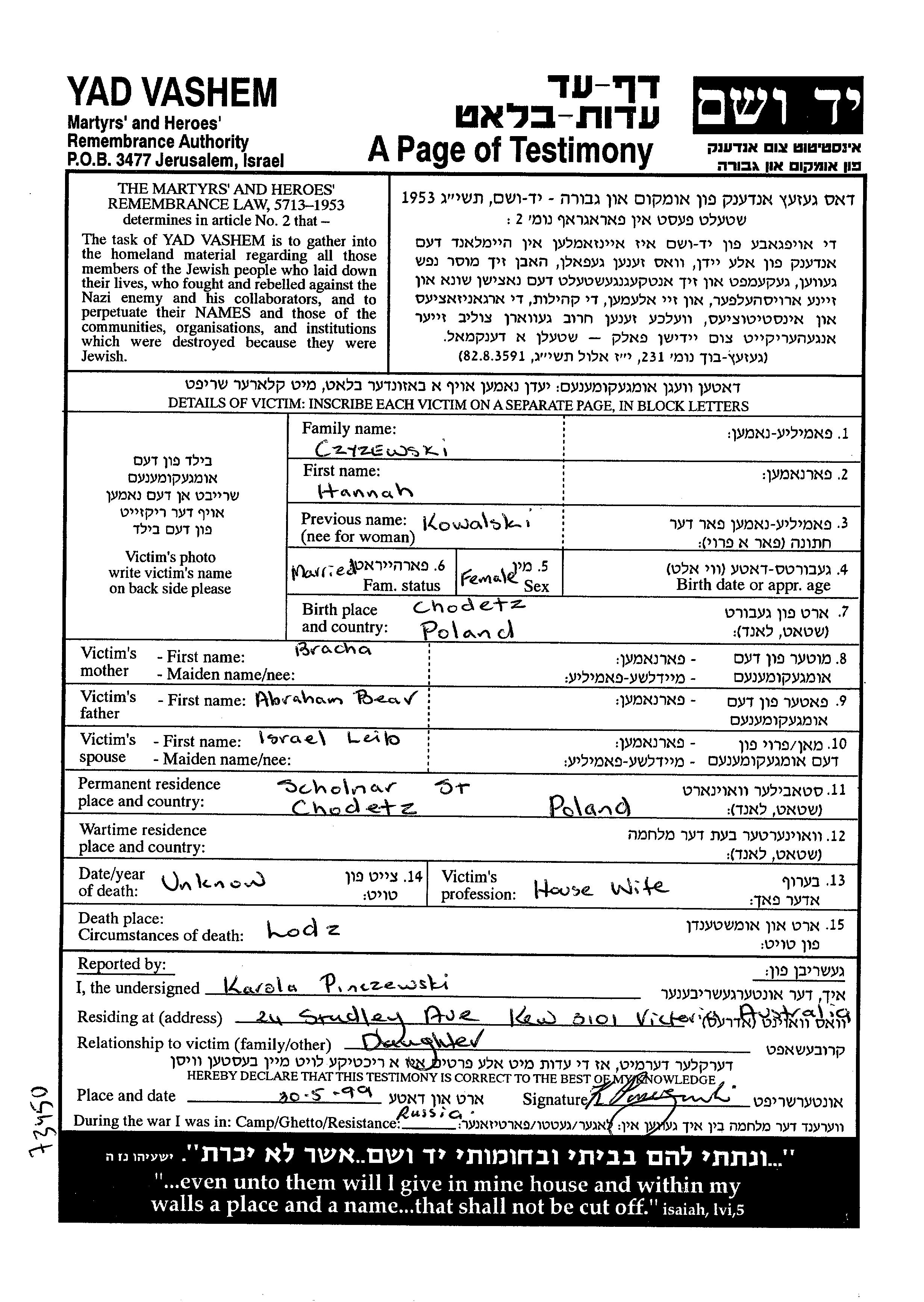Hannah Czyzewsky nee Kowalski was born in Chodecz, Poland to Bear Abraham and Bracha. She was a housewife and married to Leib Israel. Prior to WWII she lived in Chodecz, Poland. Hannah was murdered in the Shoah. Place of death: Lodz, Poland.