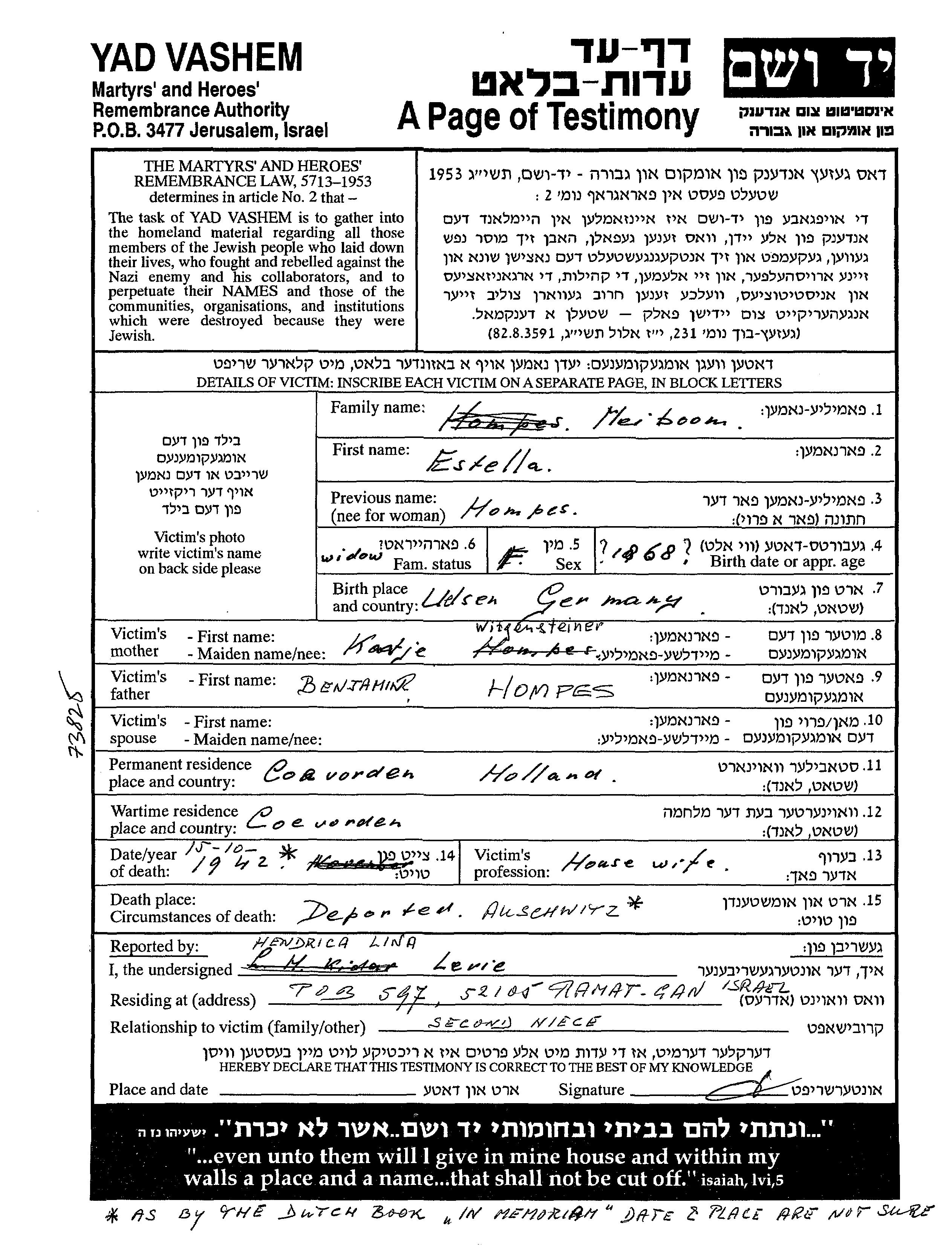 Estella Meiboom nee Hompes was born in Uelsen, Germany, 1868 to Benjamin and Katja nee Witgenstein. She was a housewife and a widow. Prior to WWII she lived in Coevorden, The Netherlands. During the war she was in Coevorden, The Netherlands. Estella was murdered in the Shoah. Place of death: Auschwitz, Poland, 15/10/1942.