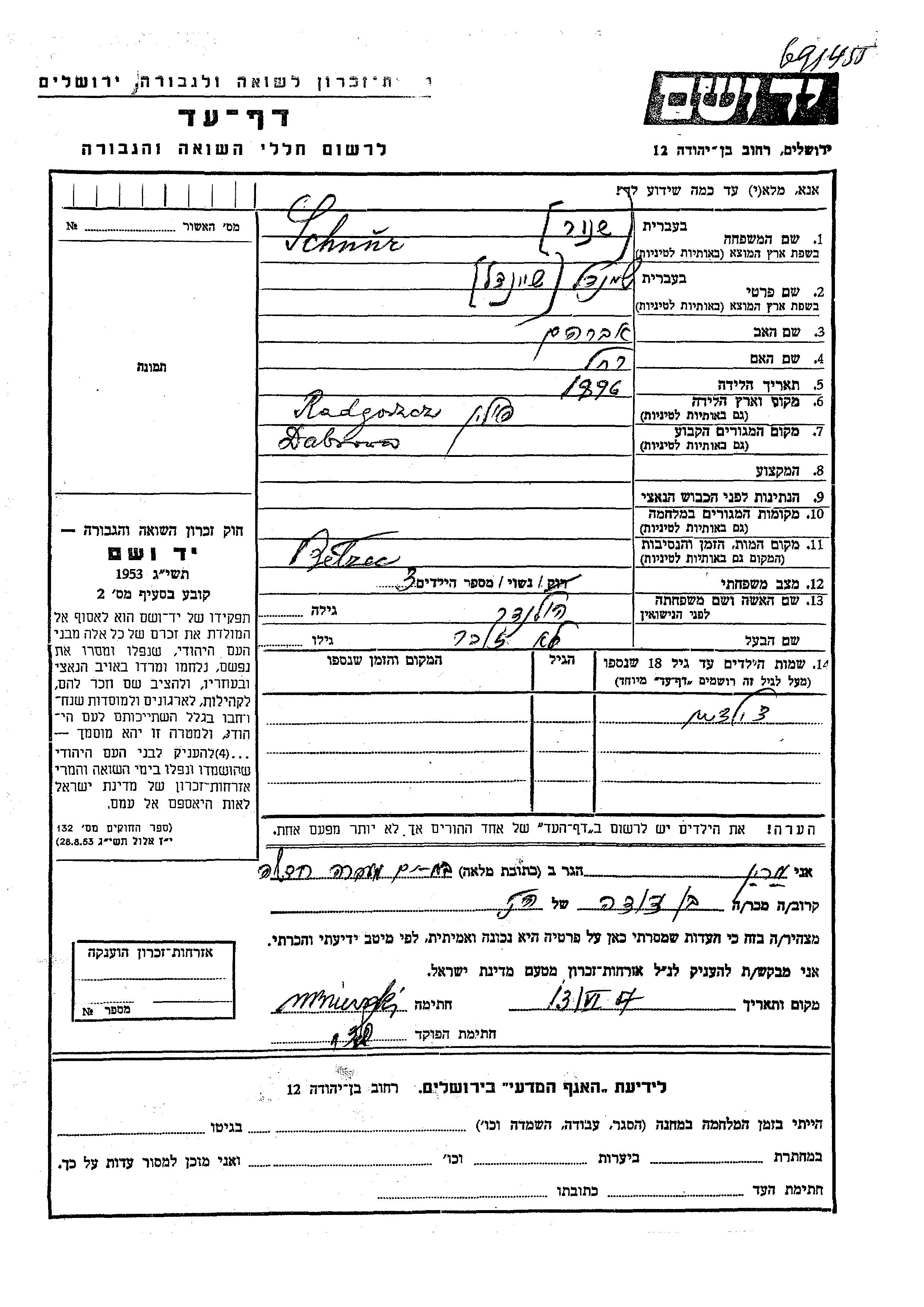 Sheindl Schnur nee Holander was born in Radgoszcz, Poland, 1896 to Avraham and Rakhel. She was married. Prior to WWII she lived in Dąbrowa, Poland. Sheindl was murdered in the Shoah. Place of death: Belzec, Poland.