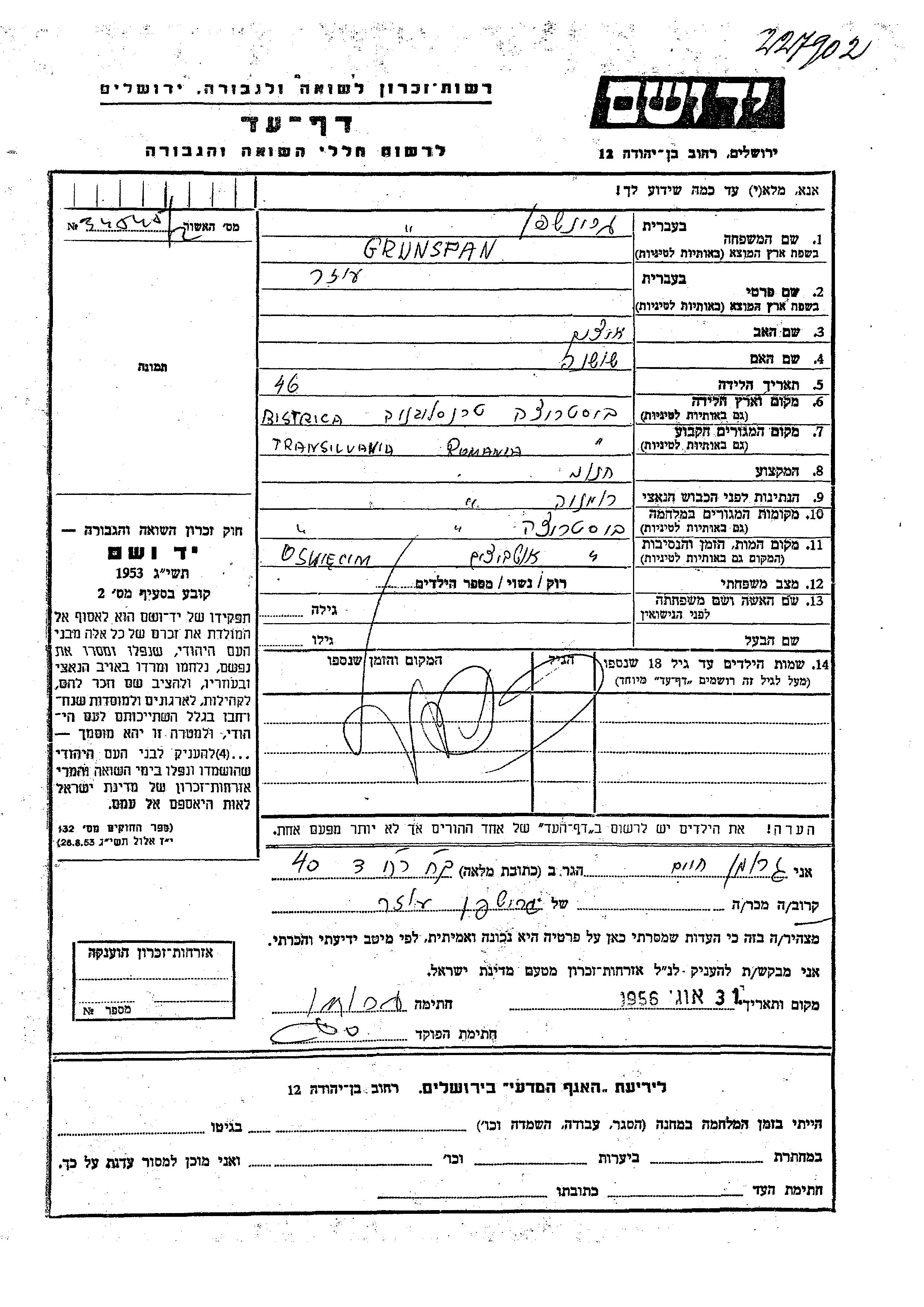 Gruenspan Ozer Bistrica, Romania Page of Testimony