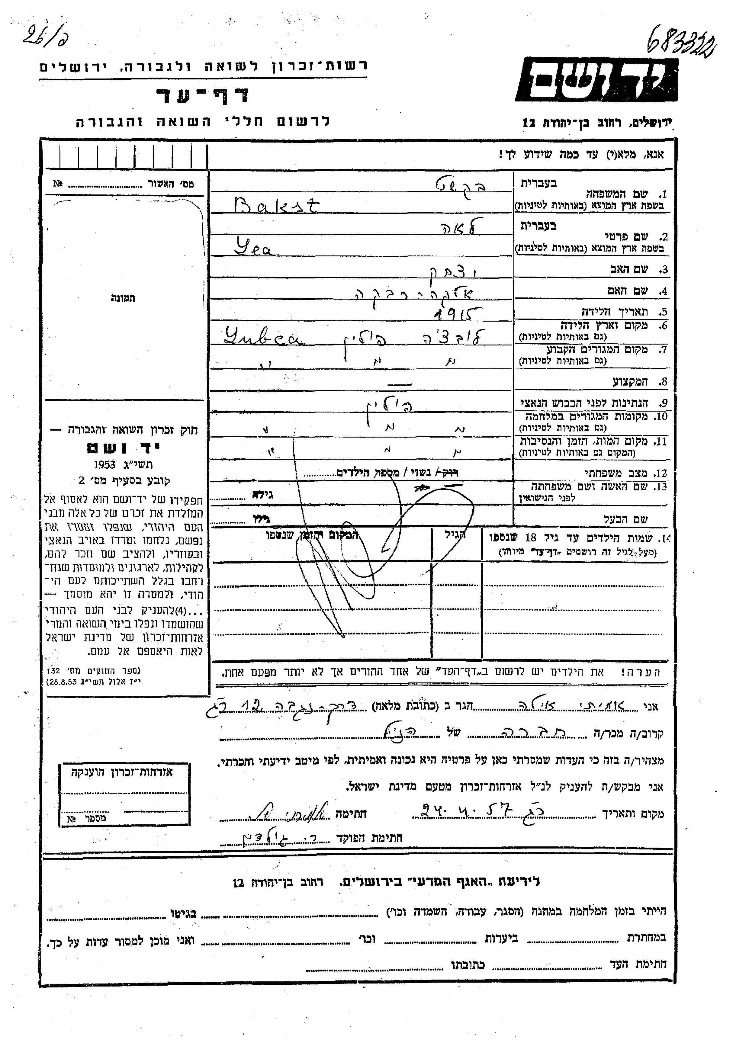 Lea Bakst was born in Lubca, Poland, 1915 to Yitzkhak and Elka Rivka. She was married. Prior to WWII she lived in Lubca, Poland. During the war she was in Lubca, Poland. Lea was murdered in the Shoah. Place of death: Lubca, Poland.