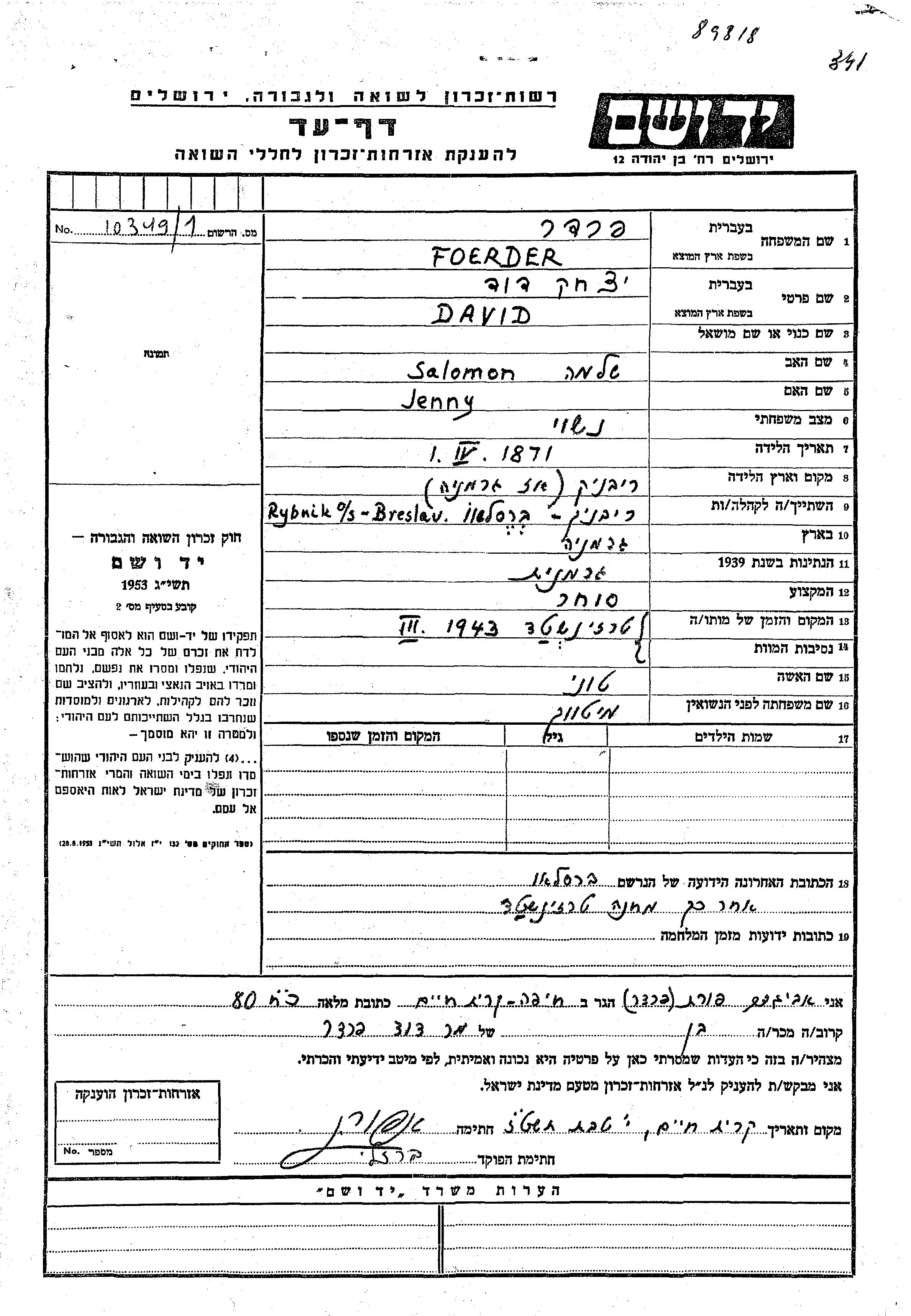 Yitzkhak David Foerder was born in Rybnik, Poland, 1871 to Salomon and Jenny. He was married to Toni nee Mitvokh. Prior to WWII he lived in Rybnik, Poland. During the war he was in Germany. Yitzkhak David was murdered in the Shoah. Place of death: unknown, 03/1943.