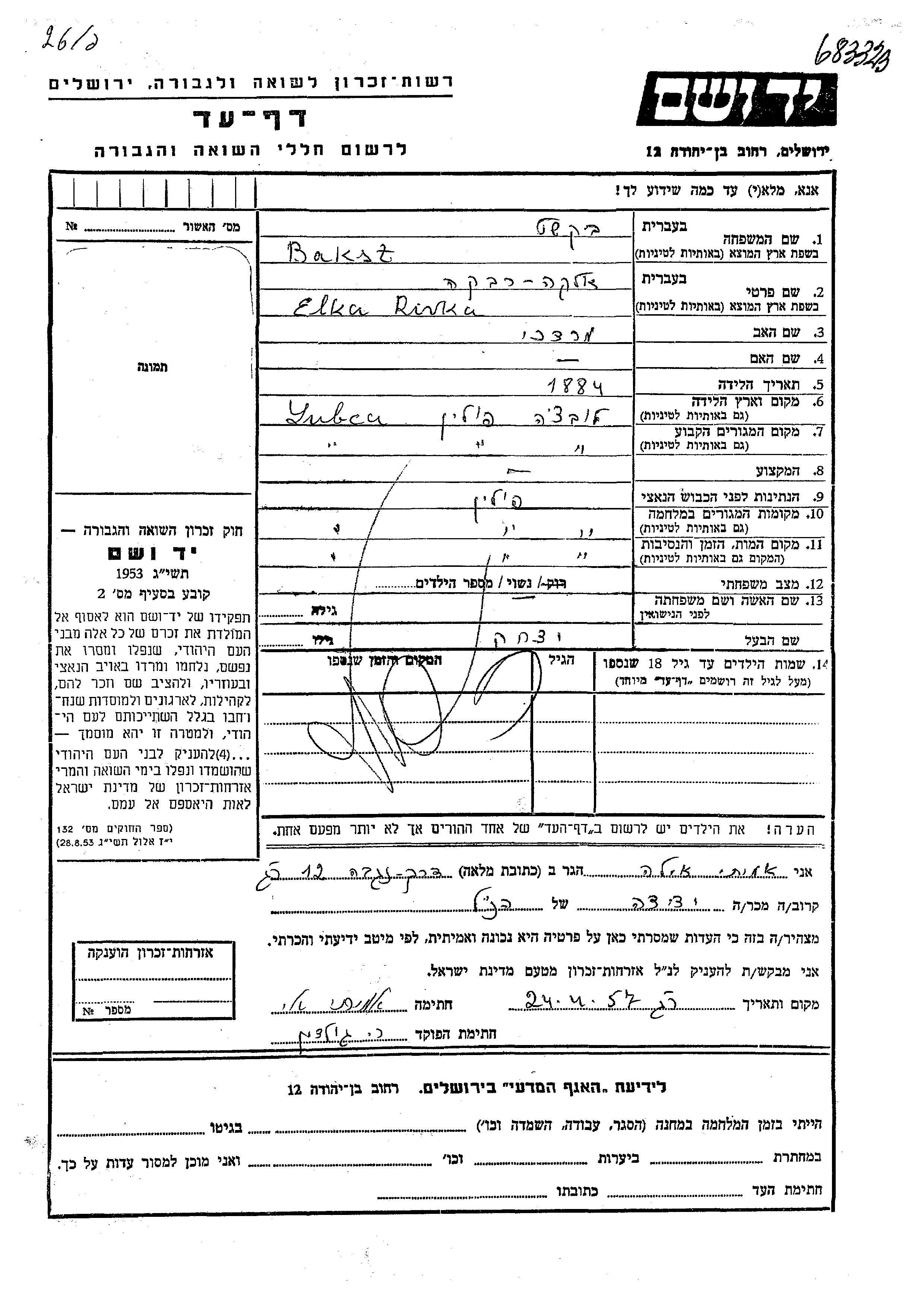 Elka Rivka Bakst was born in Lubca, Poland, 1884 to Mordekhai. She was married to Yitzkhak. Prior to WWII she lived in Lubca, Poland. During the war she was in Lubca, Poland. Elka Rivka was murdered in the Shoah. Place of death: Lubca, Poland.