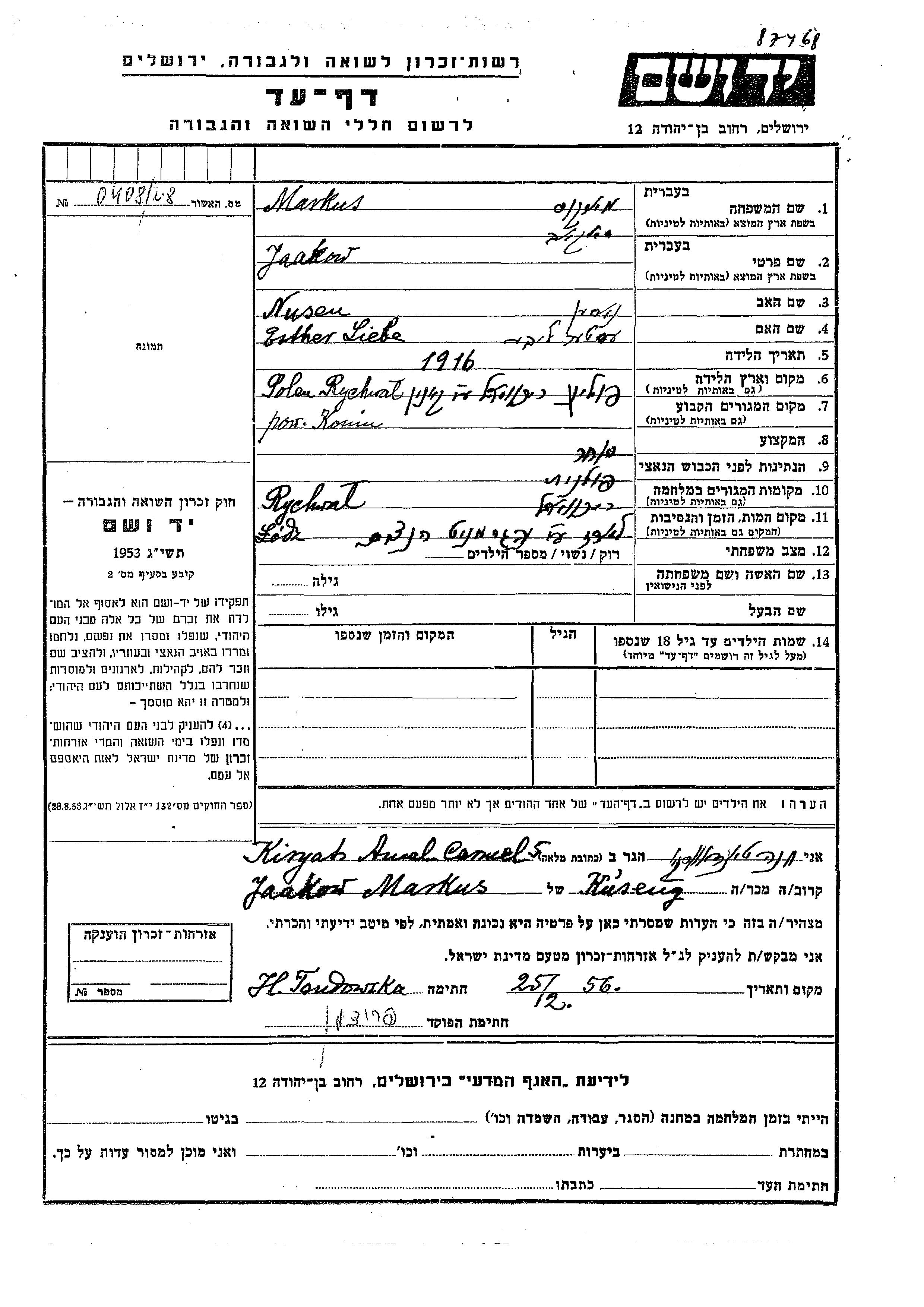 Jaakow Markus was born in Rychwal, Poland, 1916 to Nusen and Esther Liebe. He was a merchant. Prior to WWII he lived in Rychwal, Poland. During the war he was in Rychwal, Poland. Jaakow was murdered in the Shoah. Place of death: Lodz, Poland.