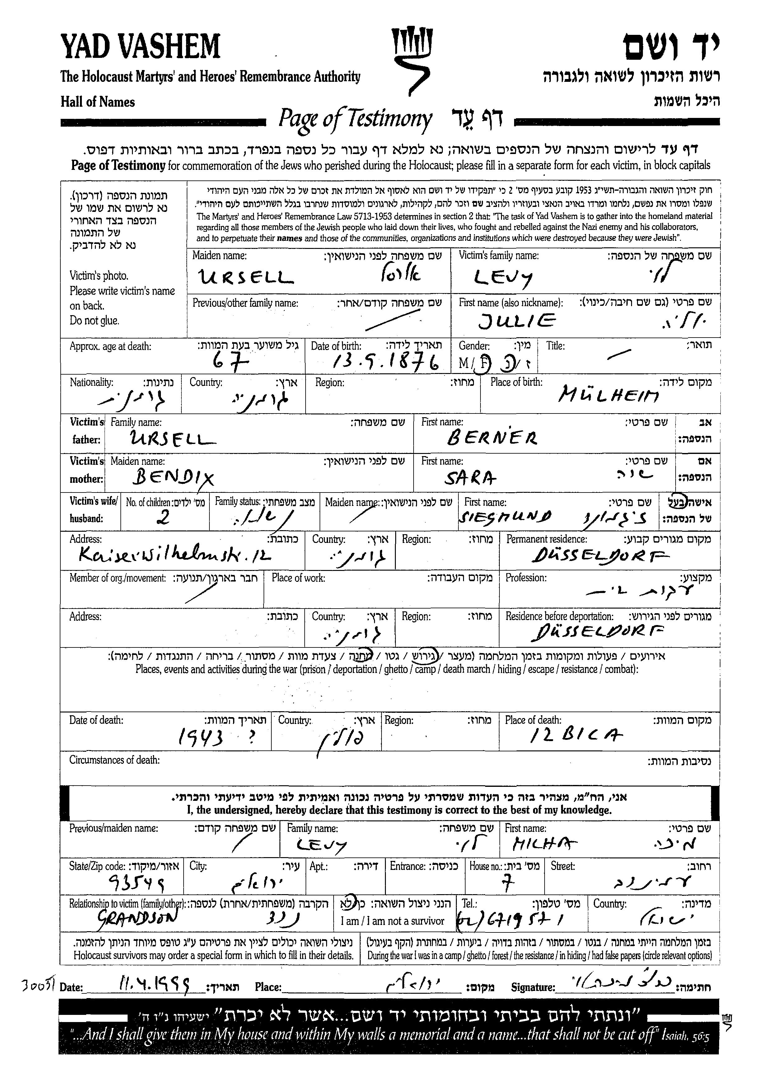 Julie Yulia Levi nee Urzel was born in Muelheim, Germany, 1876 to Berner and Sara nee Bendix. She was a housewife and married to Zigmund. Prior to WWII she lived in Duesseldorf, Germany. During the war she was in Duesseldorf, Germany. Julie Yulia was murdered in the Shoah. Place of death: Izbica, Poland, 1943.