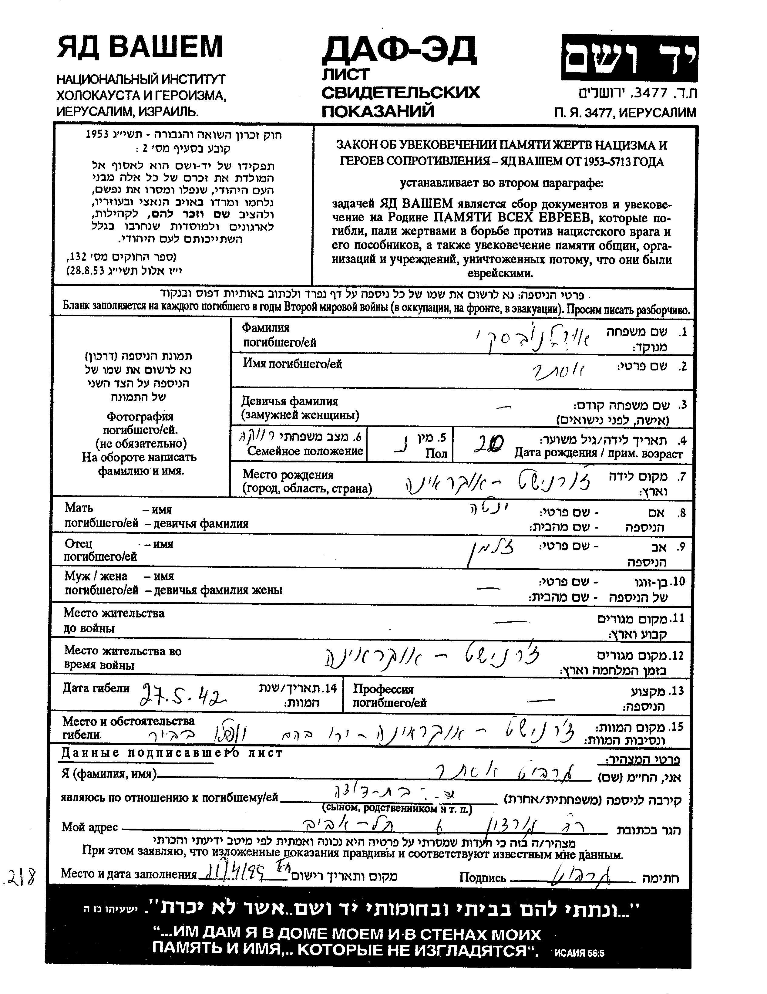 Ester Orlanovski was born in Zhornishche, Ukraine (USSR) to Zalman and Yenta. She was single. Prior to WWII she lived in Zhornishche, Ukraine (USSR). During the war she was in Zhornishche, Ukraine (USSR). Ester was murdered in the Shoah. Place of death: Zhornishche, Ukraine (USSR), 27/05/1942.