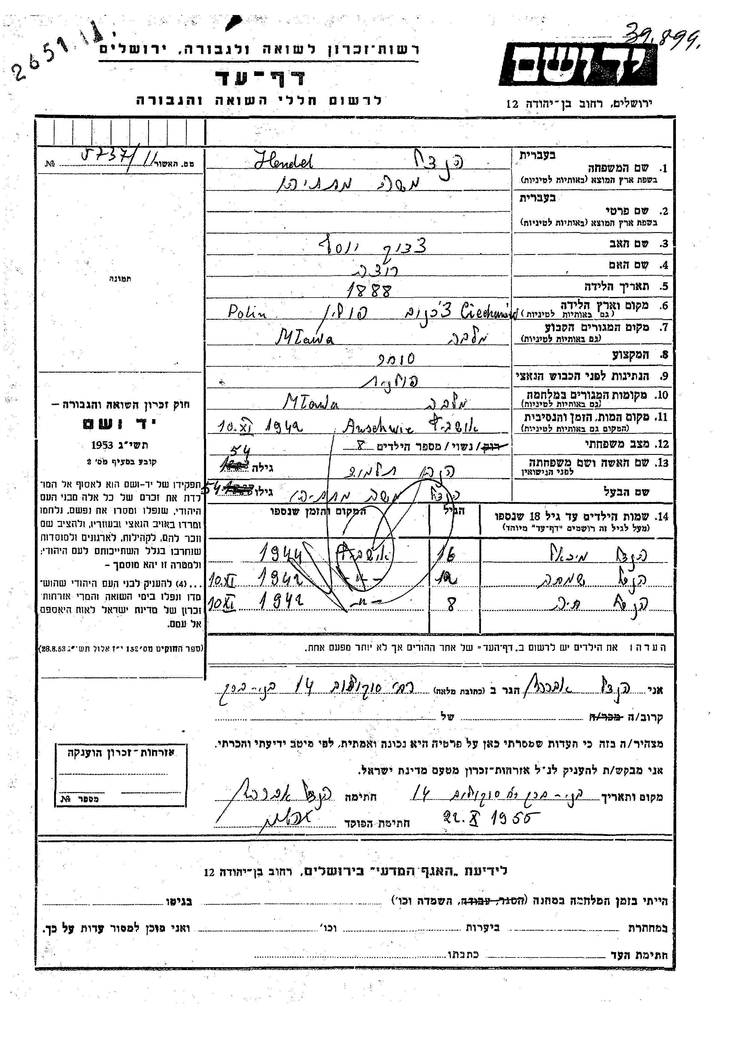 Hendel Moshe Matatiahu 1888 Mlawa, Poland Page of Testimony