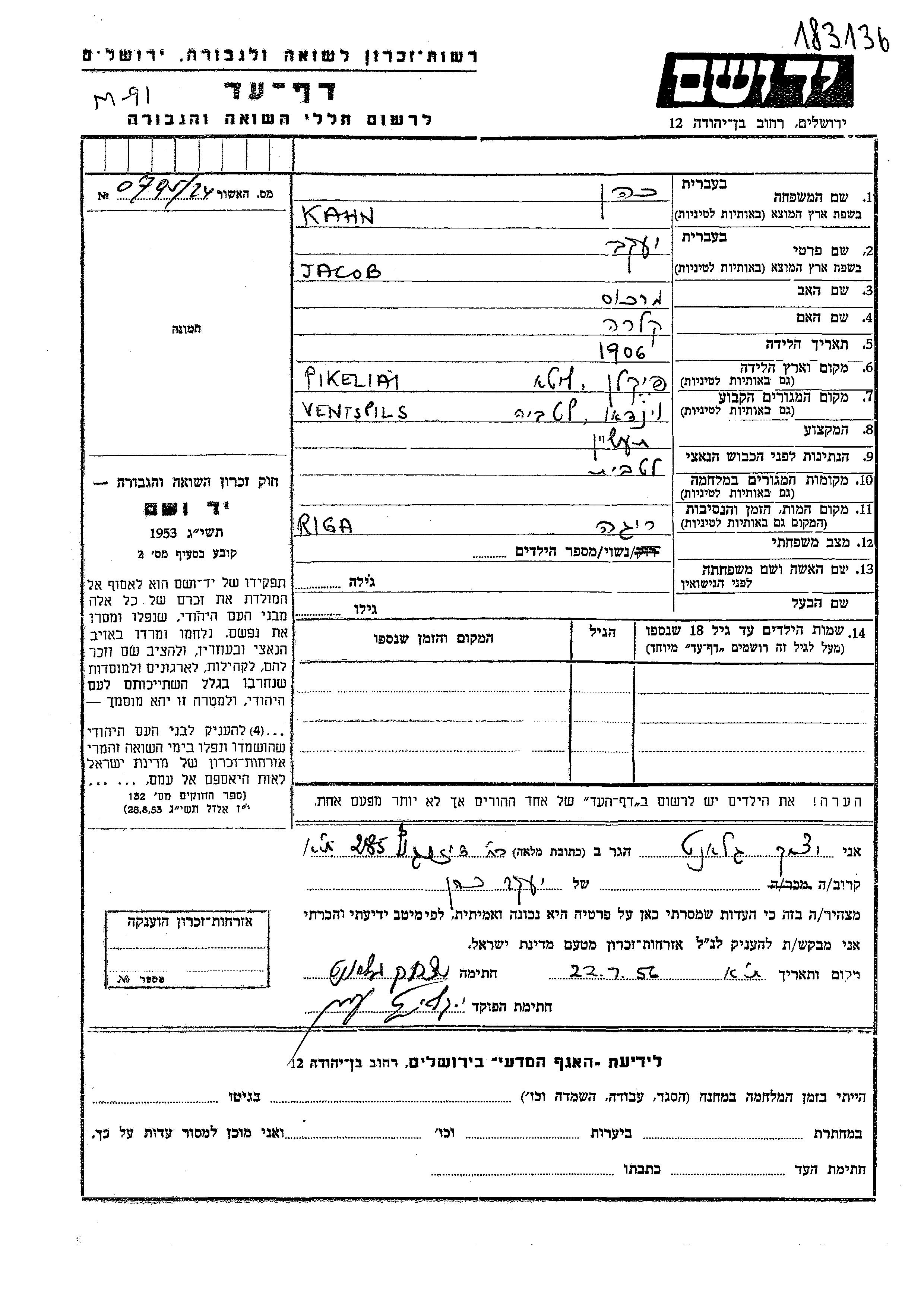 Kahn Kohen Jacob 1906 Ventspils, Latvia Page of Testimony