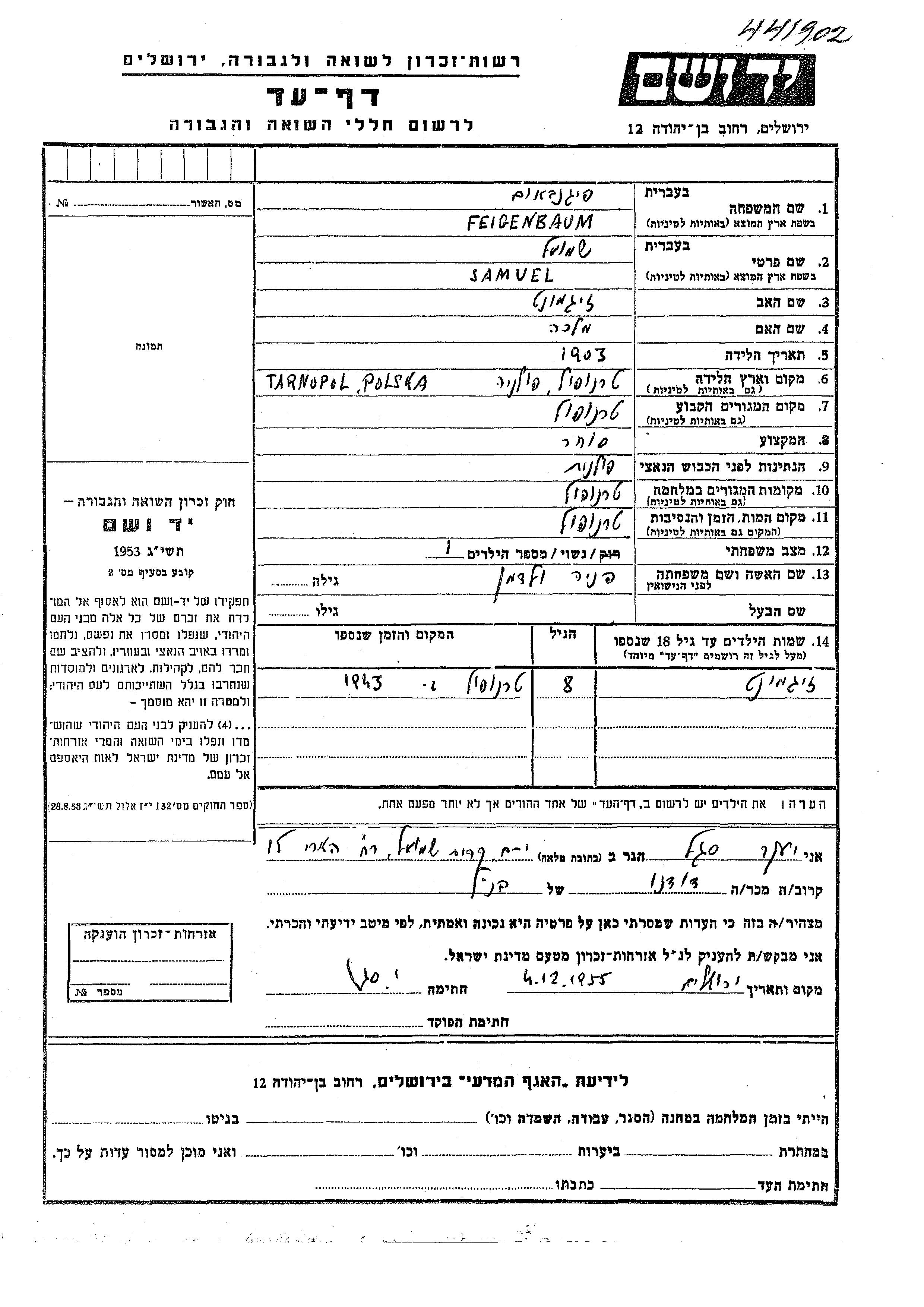 Feigenbaum Shmuel 1903 Tarnopol, Poland Page of Testimony