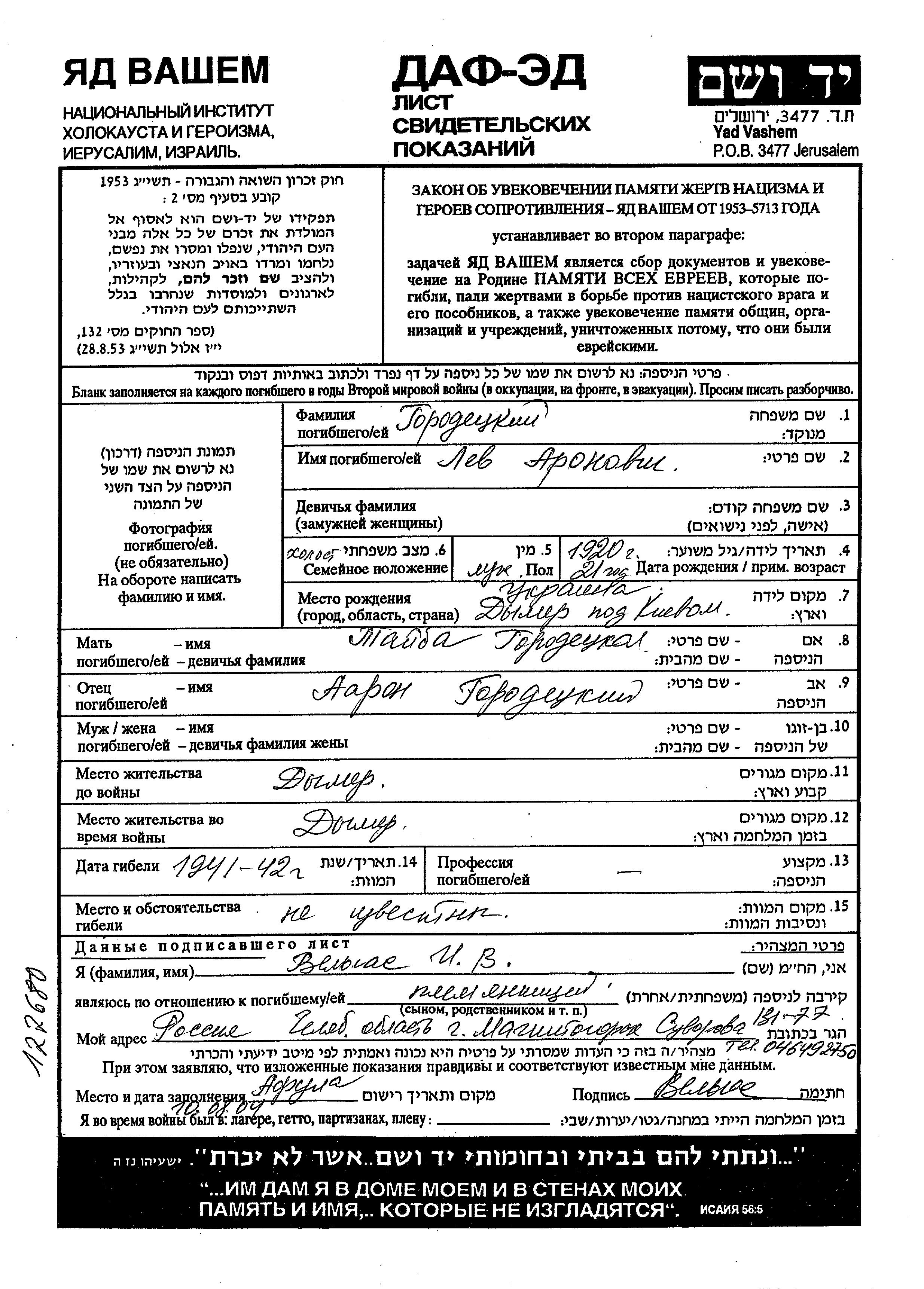 Lev Gorodetzki was born in Dymer, Ukraine (USSR), 1920 to Aaron and Taiba. He was single. Prior to WWII he lived in Dymer, Ukraine (USSR). During the war he was in Dymer, Ukraine (USSR). Lev was murdered in the Shoah. Place of death: unknown, 1941.