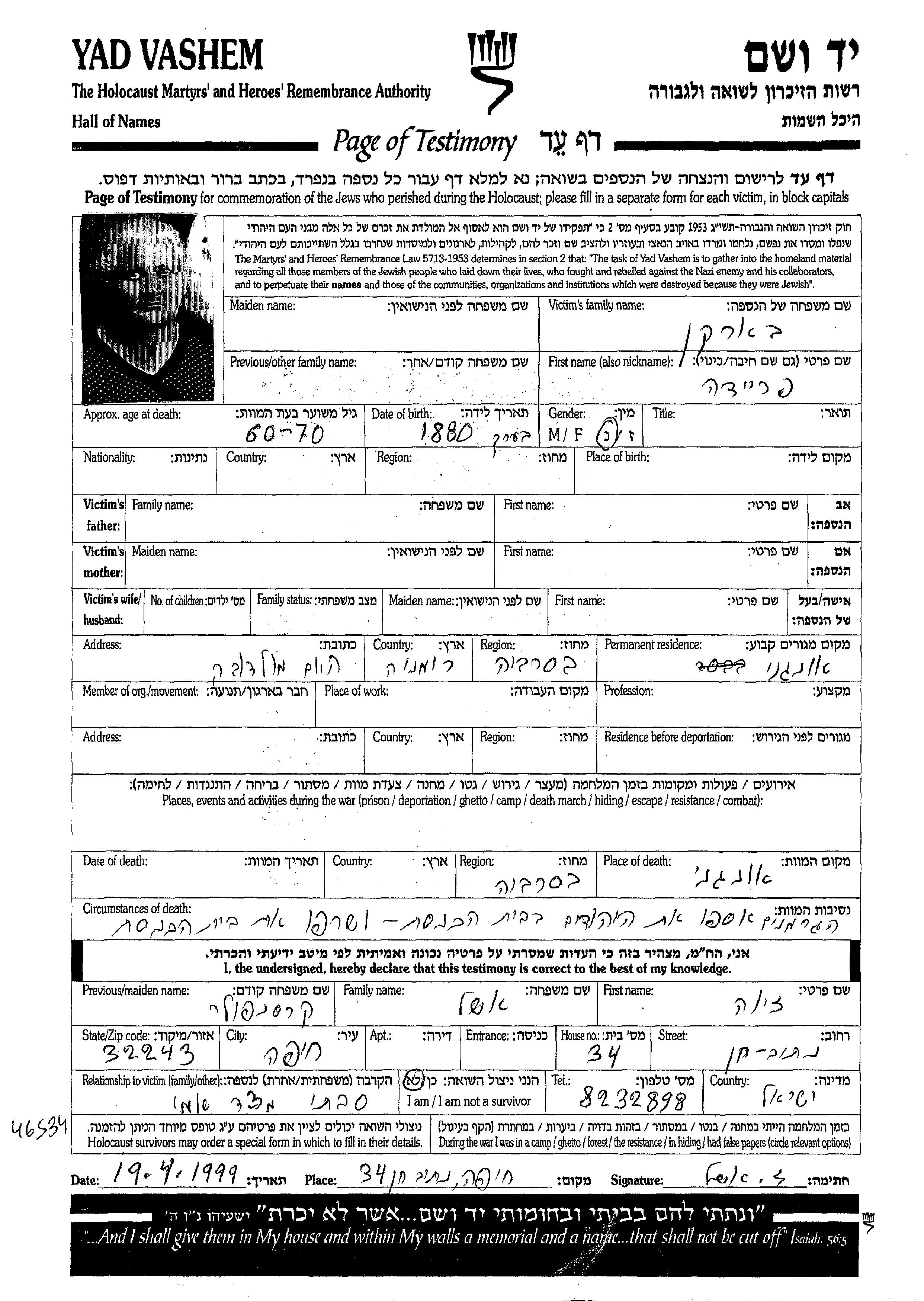 Yad Vashem - Pages of Testimony Names Memorial Collection