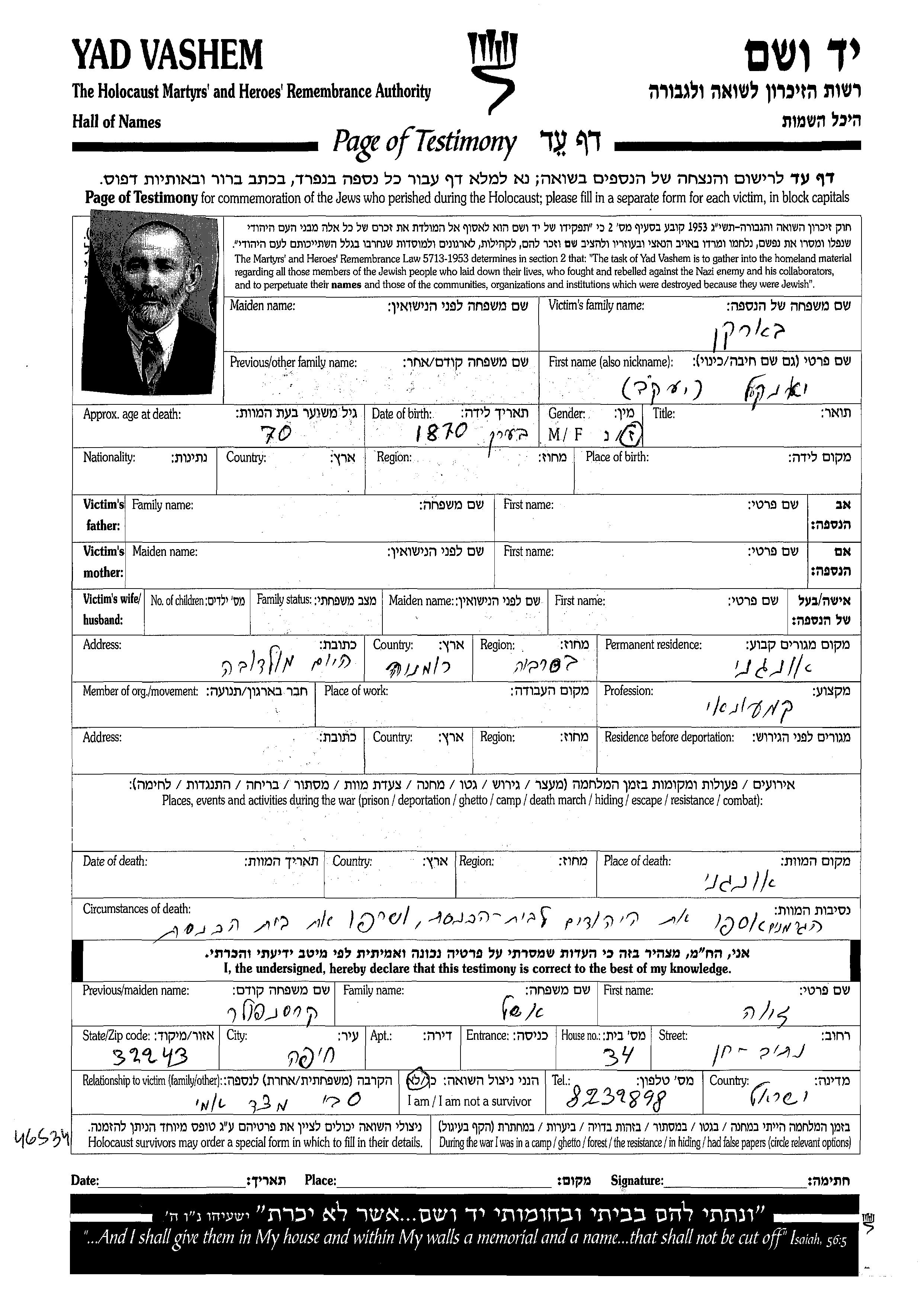 Yad Vashem - Pages of Testimony Names Memorial Collection