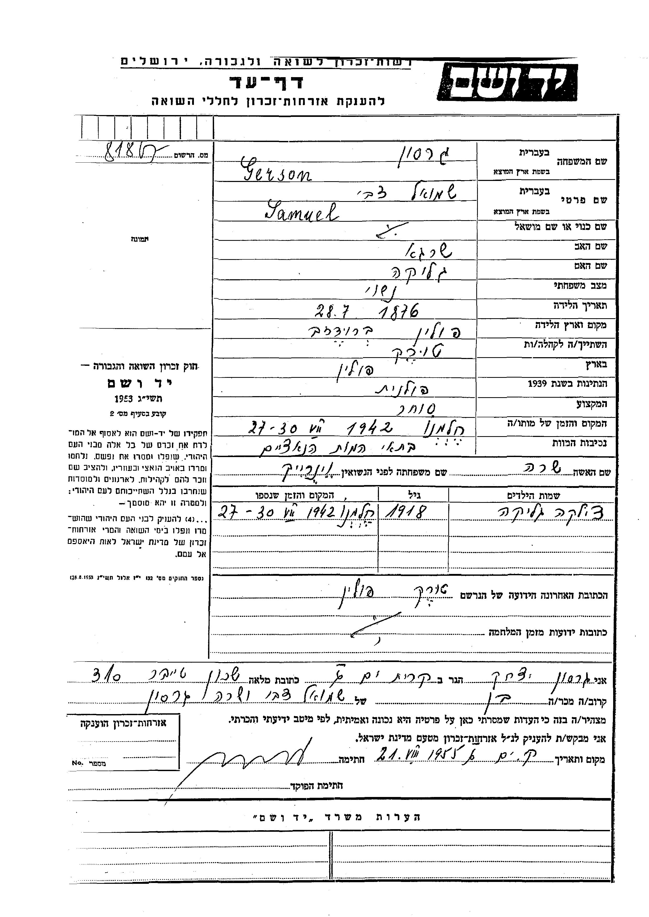 Shmuel Tzvi Gerson was born in Brudzew, Poland, 1876 to Shraga and Glika. He was a merchant and married to Sara nee Vinraykh. Prior to WWII he lived in Turek, Poland. During the war he was in Turek, Poland. Shmuel Tzvi was murdered in the Shoah. Place of death: Chelmno, Poland, 27/07/1942.