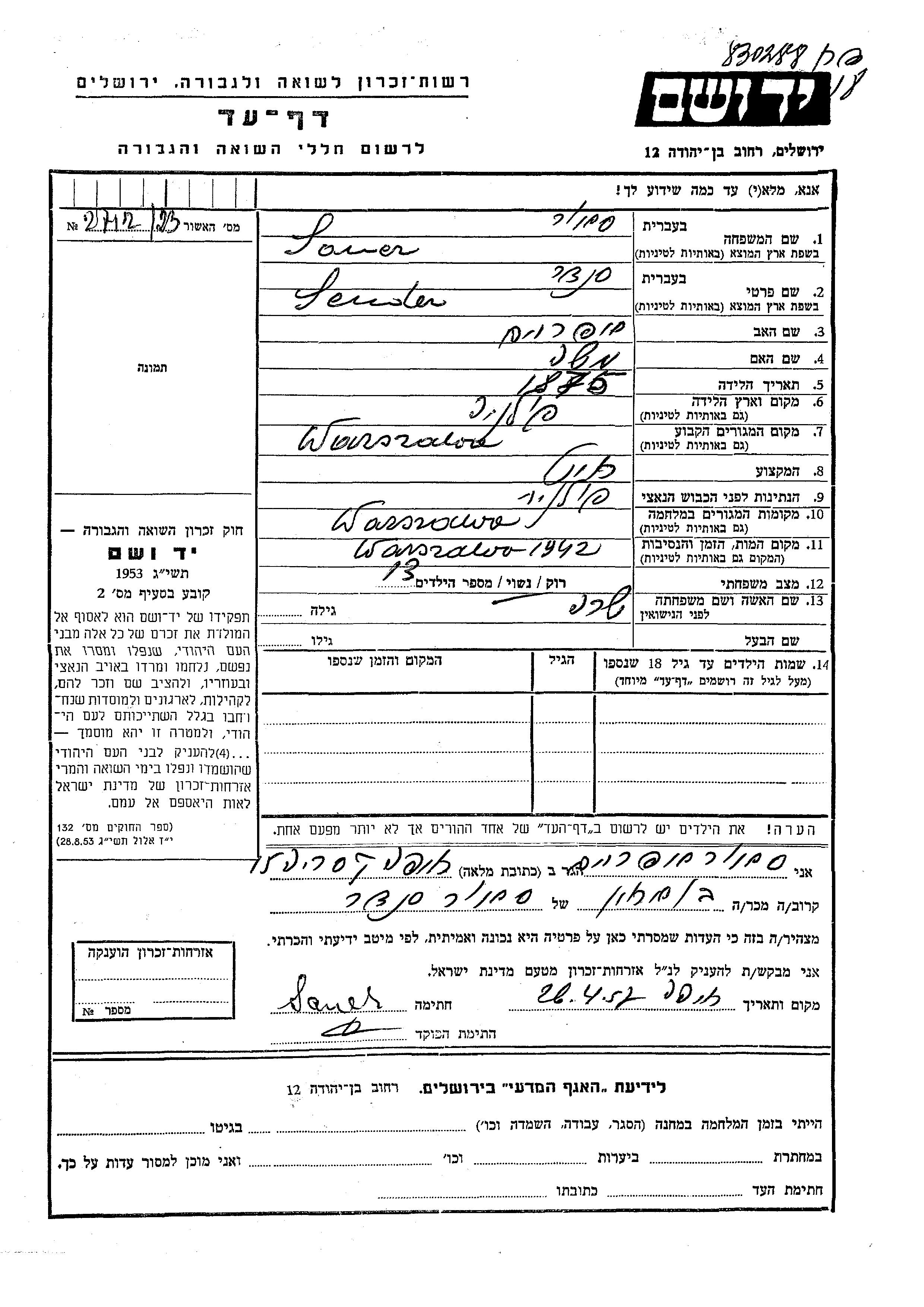 Sauer Sender 1875 Warsaw, Poland Page of Testimony