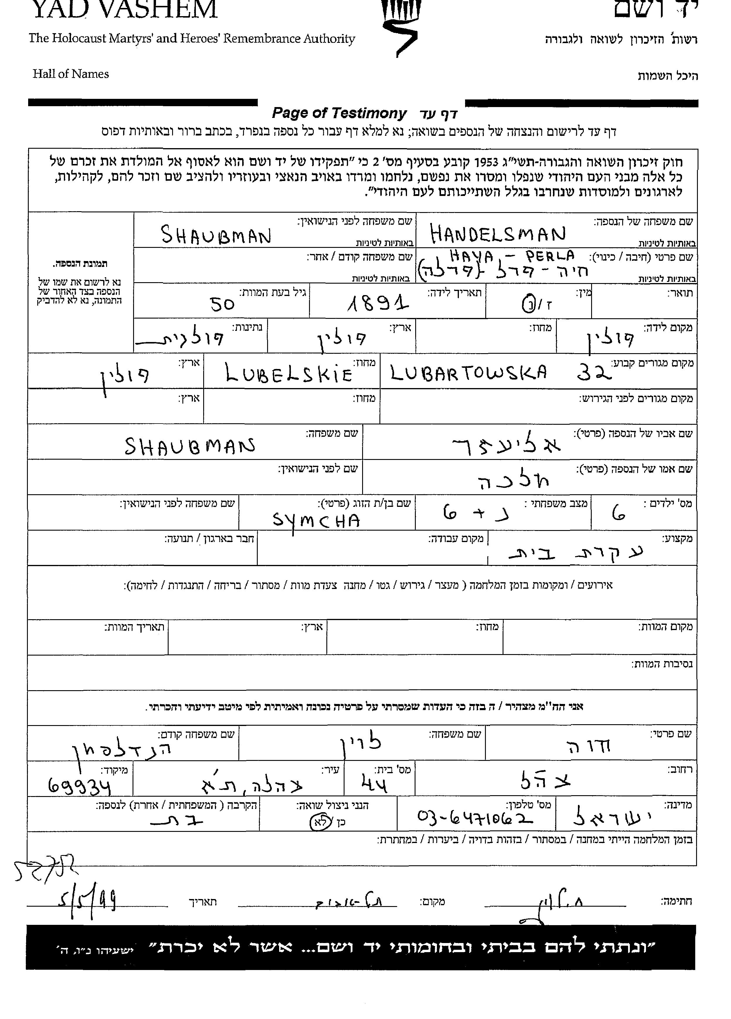 Haya Perla Handelsman nee Shaubman was born in Lublin, Poland, 1891 to Eliezer and Malka. She was a housewife and married to Symcha. Prior to WWII she lived in Lublin, Poland.