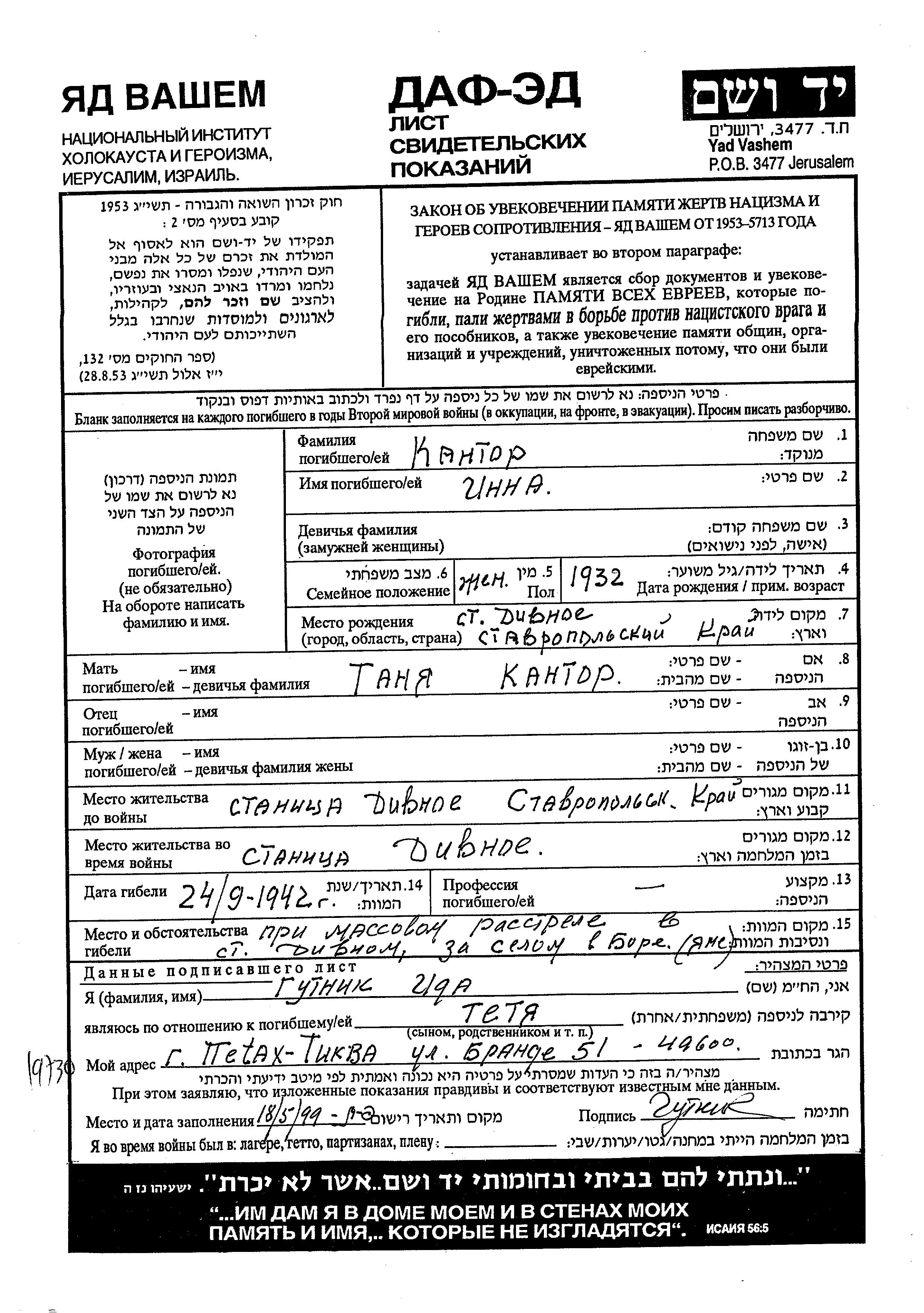 Inna Kantor was born in Divnoye, Russia (USSR), 1932 to Tanya. Prior to WWII she lived in Divnoye, Russia (USSR). During the war she was in Divnoye, Russia (USSR). Inna was murdered in the Shoah. Place of death: Divnoye, Russia (USSR), 24/09/1942.