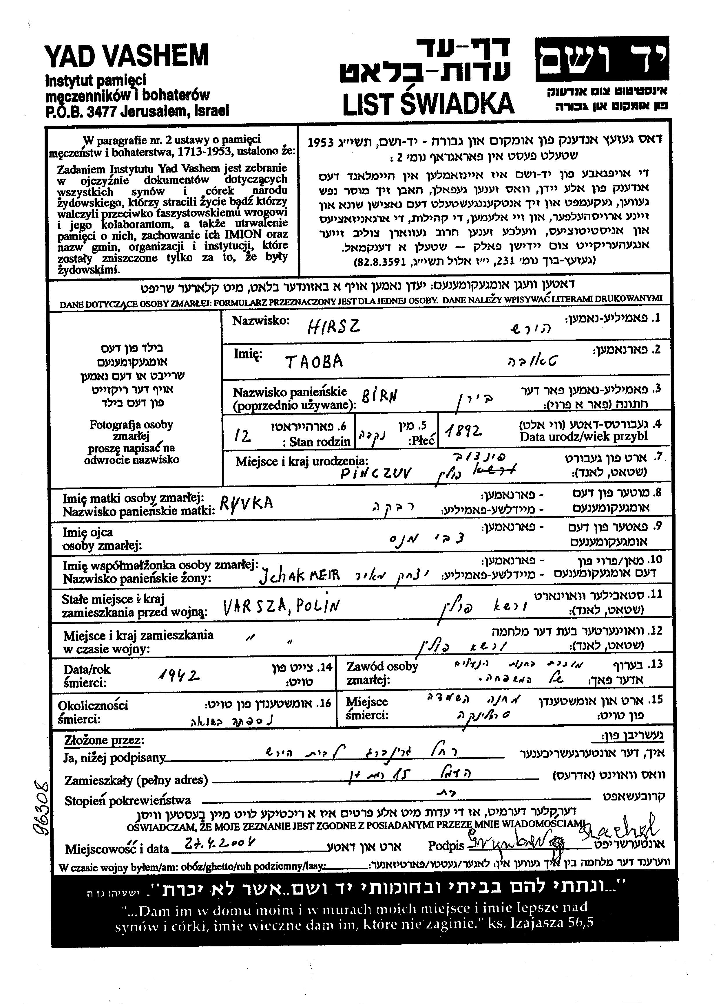 Tauba Hirsh nee Birn was born in Pinczow, Poland, 1892 to Tzvi Manes and Rivka. She was a seller at shoe shop and married to Meir Ichak. Prior to WWII she lived in Warszawa, Poland. During the war she was in Varsha, Poland. Tauba was murdered in the Shoah. Place of death: Treblinka, Poland, 1942.