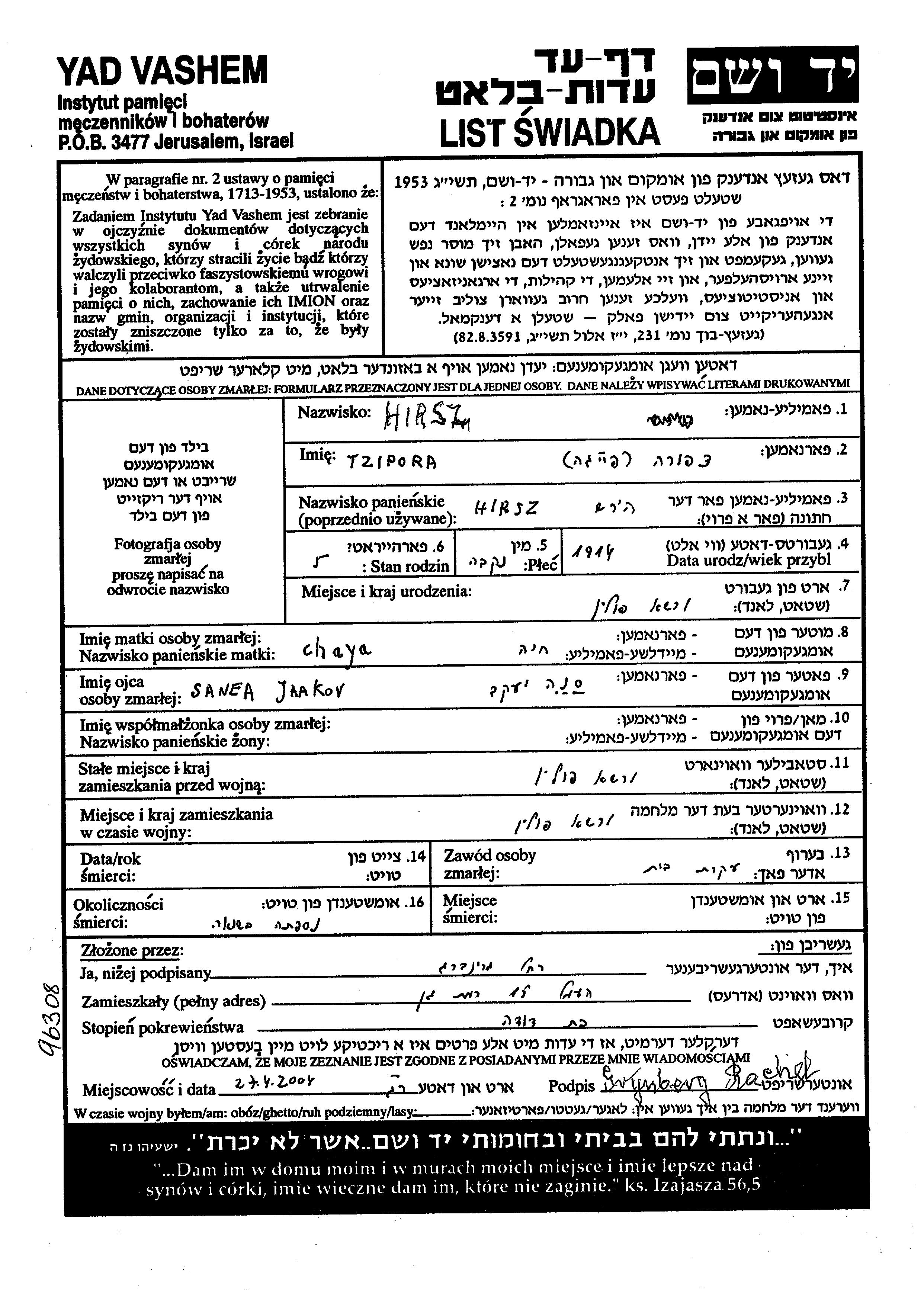 Tzipora Feiga Hirsz nee Hirsz was born in Warsaw, Poland, 1914 to Yaakov Sana and Khaia. She was a housewife. Prior to WWII she lived in Warsaw, Poland. During the war she was in Warsaw, Poland. Tzipora Feiga was murdered in the Shoah.