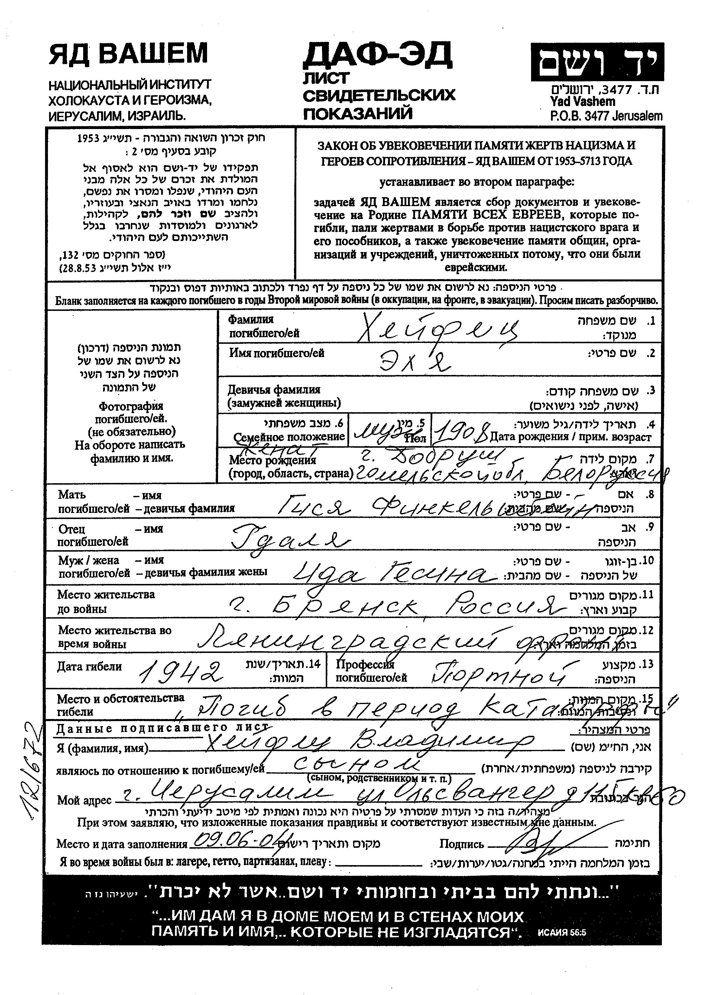 Kheifetz Elya 1908 Bryansk, Russia (USSR) Page of Testimony