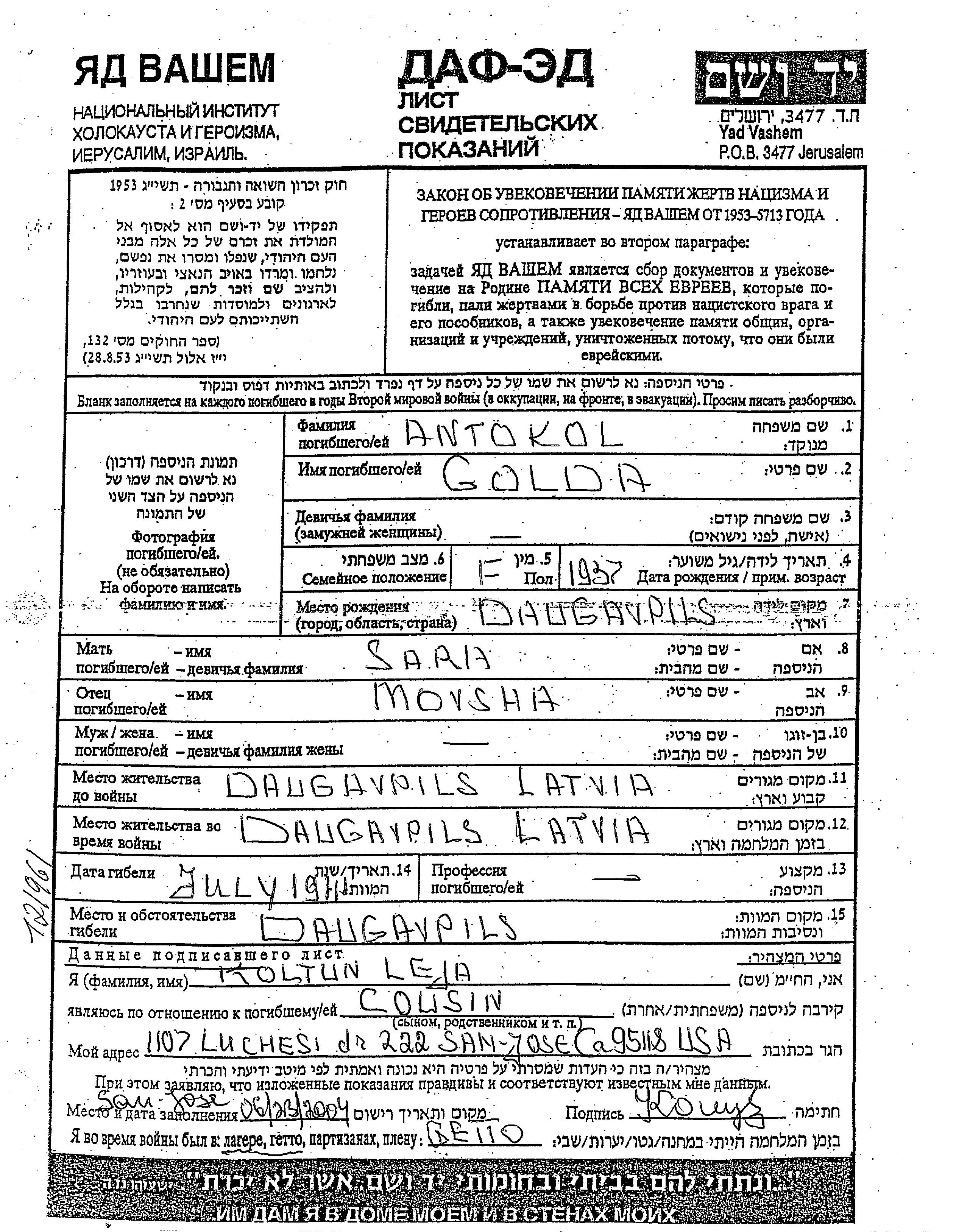 Golda Antokol was born in Daugavpils, Latvia, 1937 to Movsha and Sara. She was child. Prior to WWII she lived in Daugavpils, Latvia. During the war she was in Daugavpils, Latvia. Golda was murdered in the Shoah. Place of death: Daugavpils, Latvia, 07/1941.
