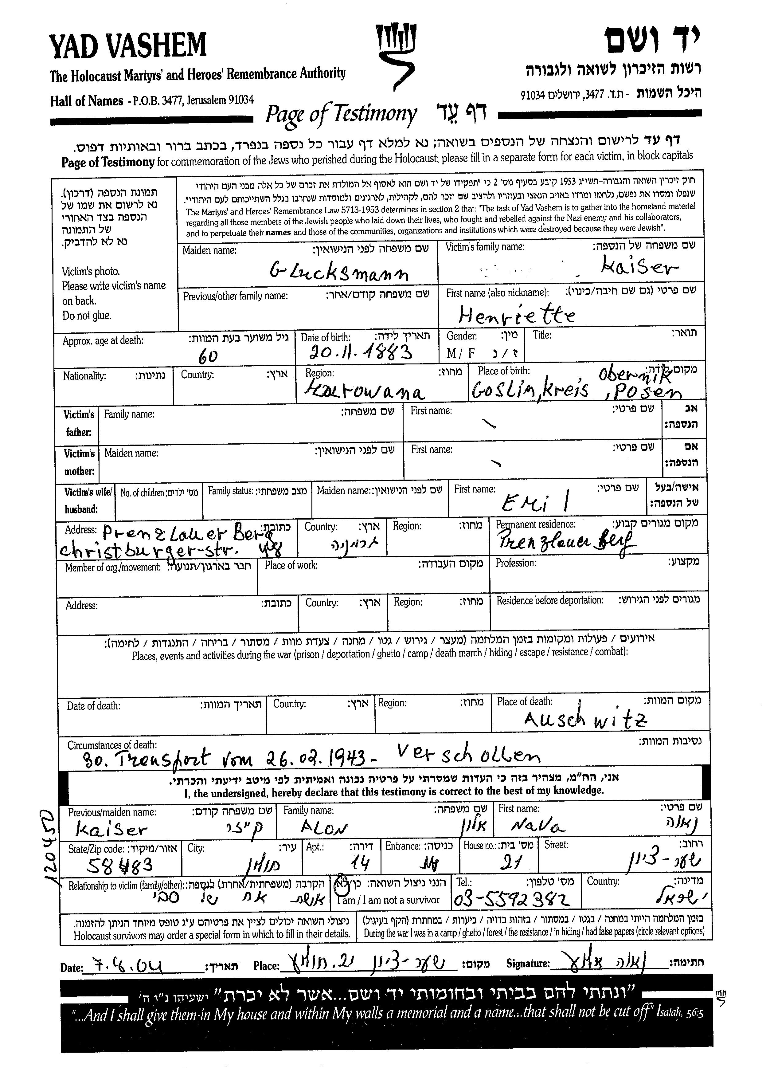 Henriette Kaiser nee Glucksmann was born in Oborniki, Poland, 1883. Prior to WWII she lived in Prenzlauer Berg, Germany. Henriette was murdered in the Shoah. Place of death: Auschwitz, Poland.