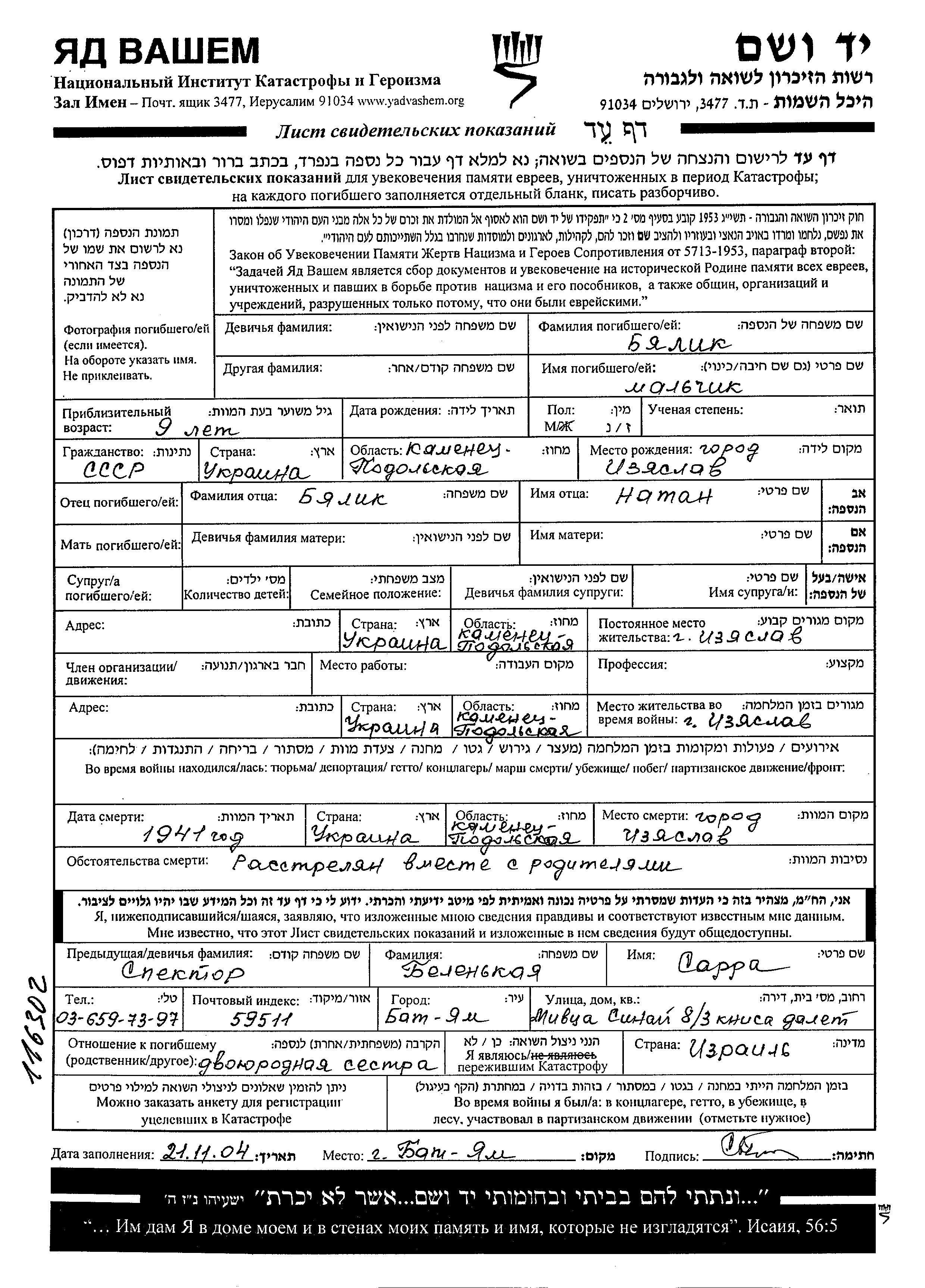 Byalik First name unknown Izyaslav, Ukraine (USSR) Page of Testimony