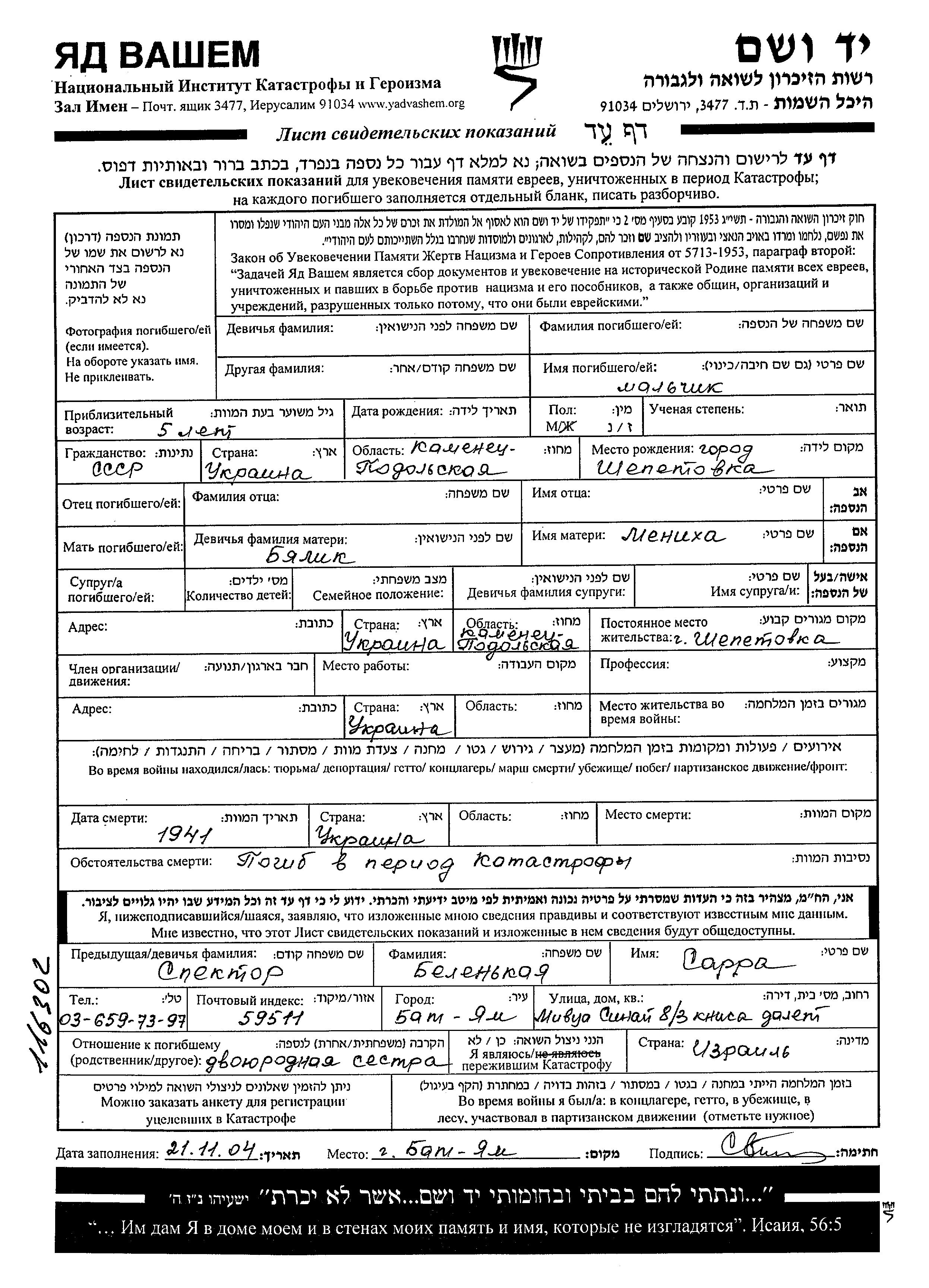First name unknown Surname unknown was born in Shepetovka, Ukraine (USSR) to Menikha. He was child. Prior to WWII he lived in Shepetovka, Ukraine (USSR). He was murdered in the Shoah. Place of death: unknown, 1941.