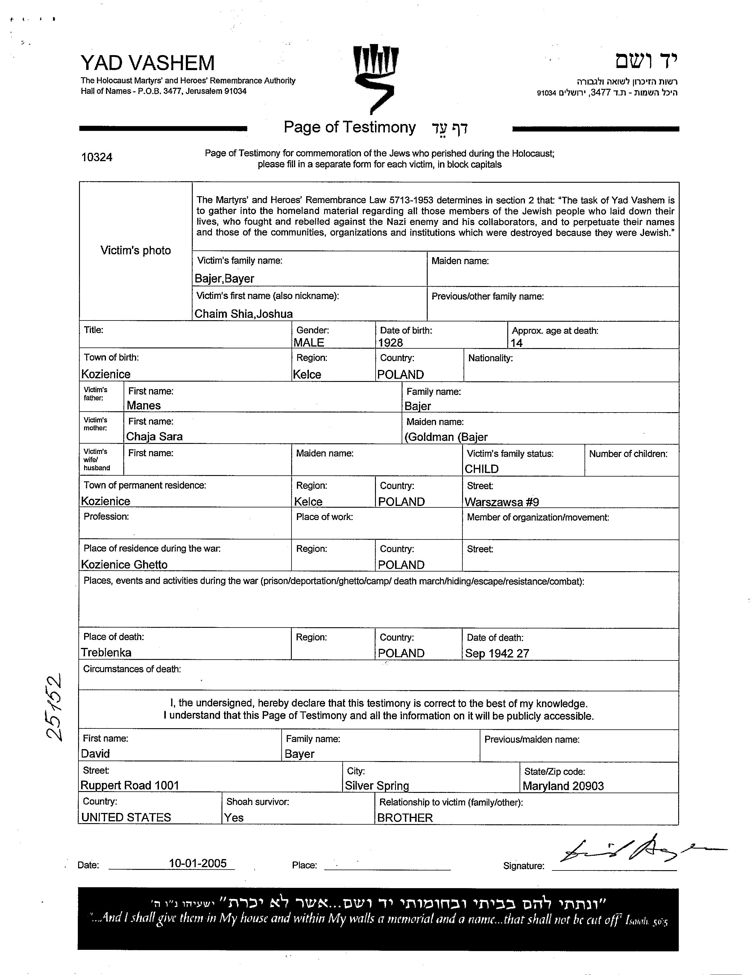 Bajer Shaia Chaim Joshua 1928 Kozienice, Poland Page of Testimony (digital signed)