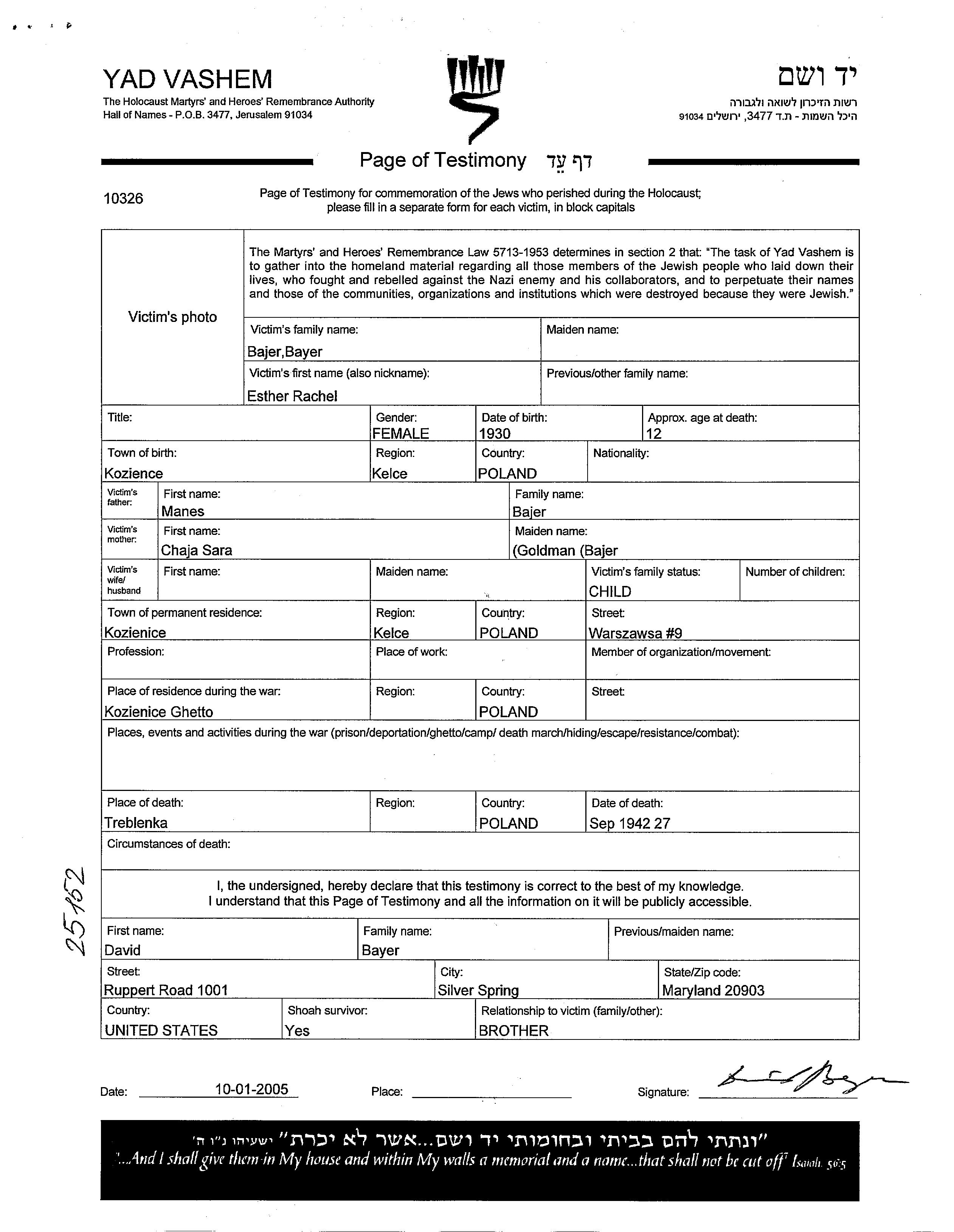 Bajer Esther Rachel 1930 Kozienice, Poland Page of Testimony (digital signed)