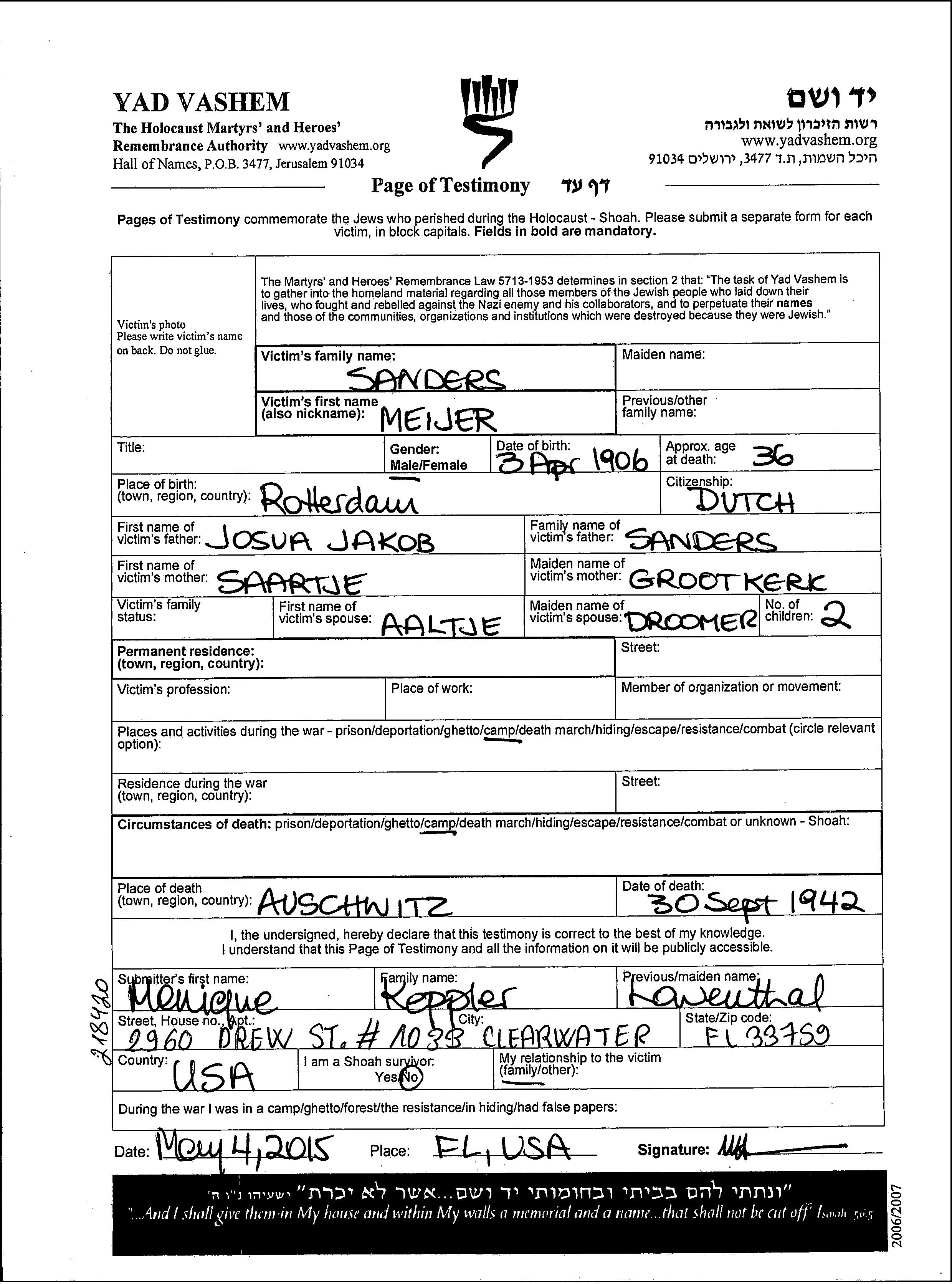 Sanders Meijer Rotterdam, The Netherlands Page of Testimony