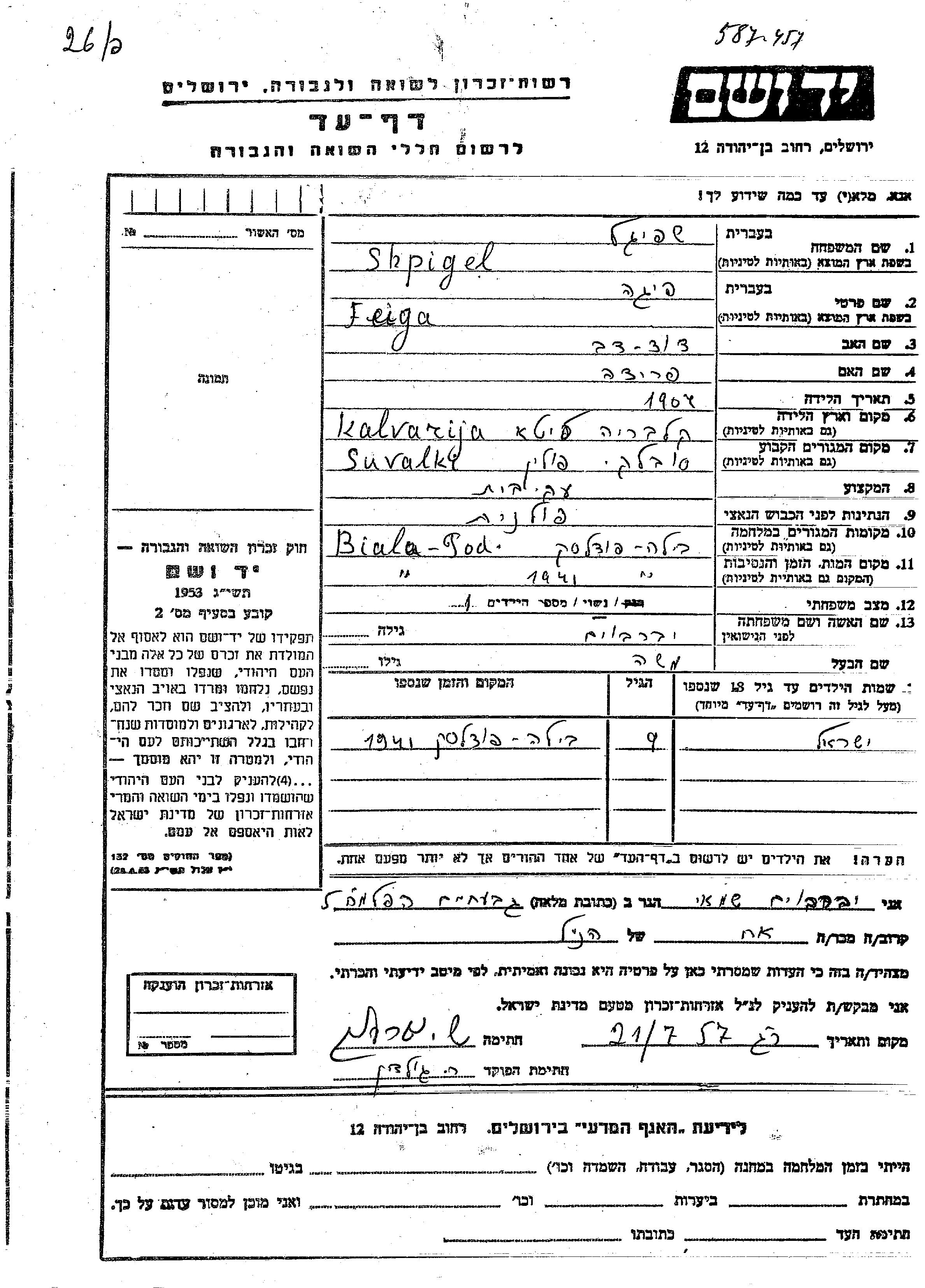 Feiga Shpigel nee Iaverboim was born in Kalvarija, Lithuania, 1904 to David Dov and Frida. She was a housewife and married to Moshe. Prior to WWII she lived in Suwalki, Poland. During the war she was in Biala Podlaska, Poland. Feiga was murdered in the Shoah. Place of death: Biala Podlaska, Poland, 1941.