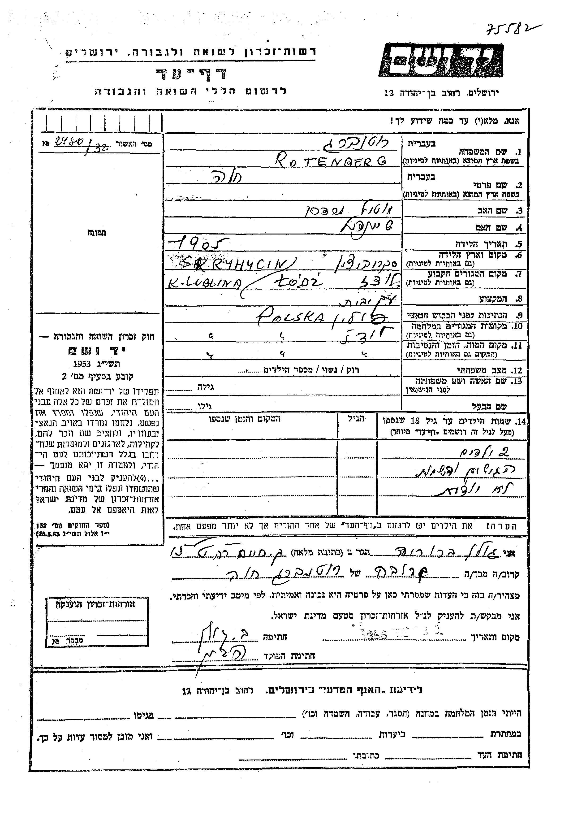 Khava Rotenberg was born in Skryhiczyn, Poland, 1905 to Motil and Sheindil. She was a housewife and married. Prior to WWII she lived in Lodz, Poland. During the war she was in Lodz, Poland. Khava was murdered in the Shoah. Place of death: Lodz, Poland.