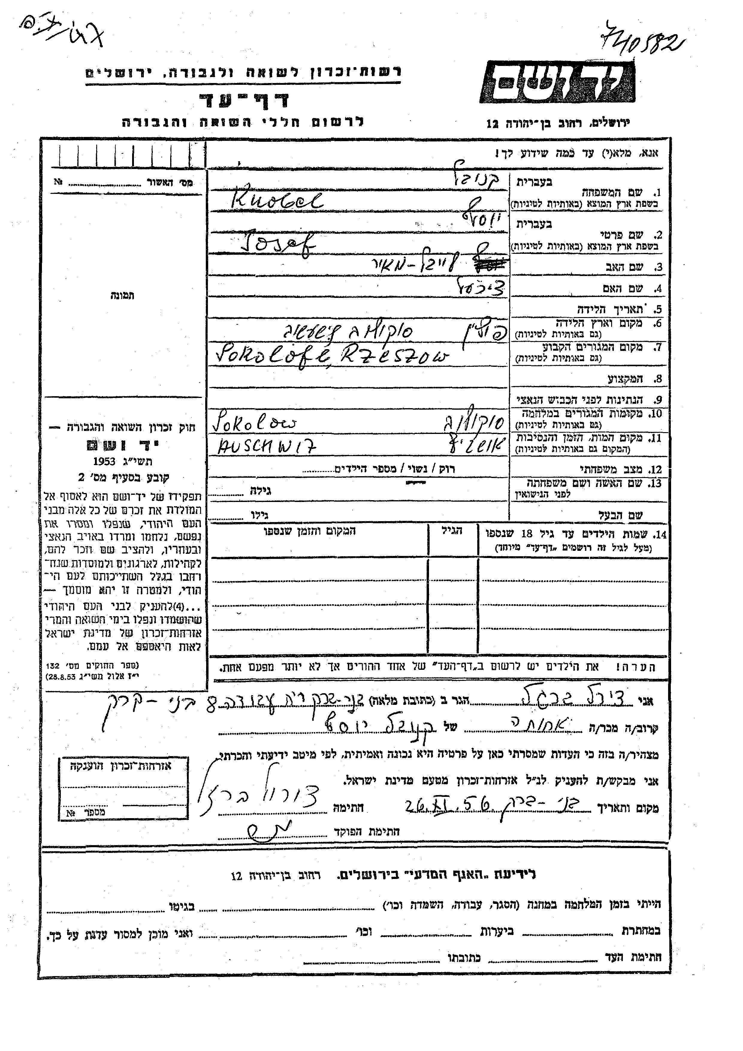 Josef Knobel was born in Sokolow Malopolski, Poland to Leibel Meir and Tzirel. He was married. Prior to WWII he lived in Sokolow Malopolski, Poland. During the war he was in Sokolow Malopolski, Poland. Josef was murdered in the Shoah. Place of death: Auschwitz, Poland.