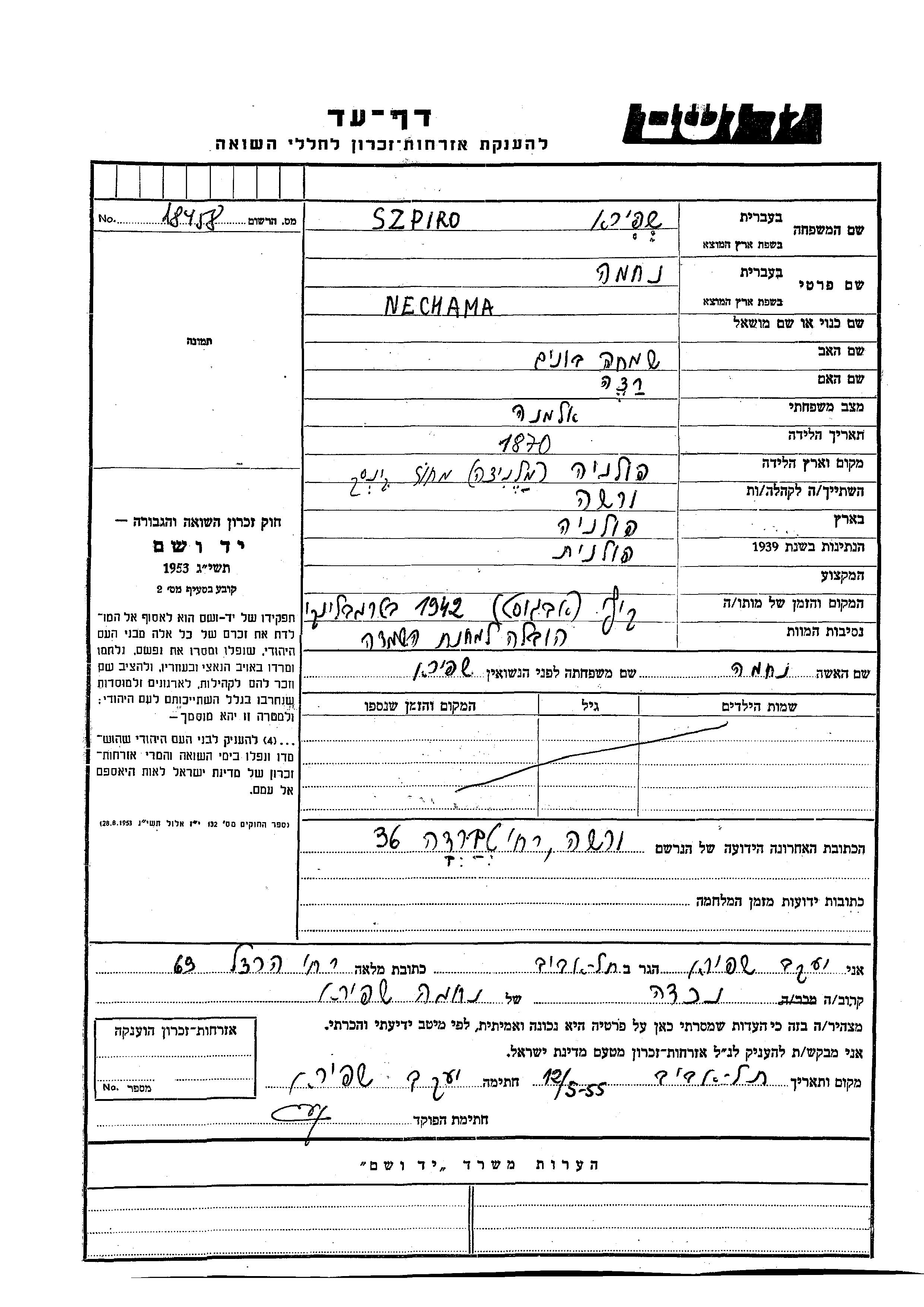 Nechama Szpiro was born in Maleniec, Poland, 1870 to Simkha Bunim and Ratza. She was a widow. Prior to WWII she lived in Warszawa, Poland. Nechama was murdered in the Shoah. Place of death: Treblinka, Poland, 08/1942.