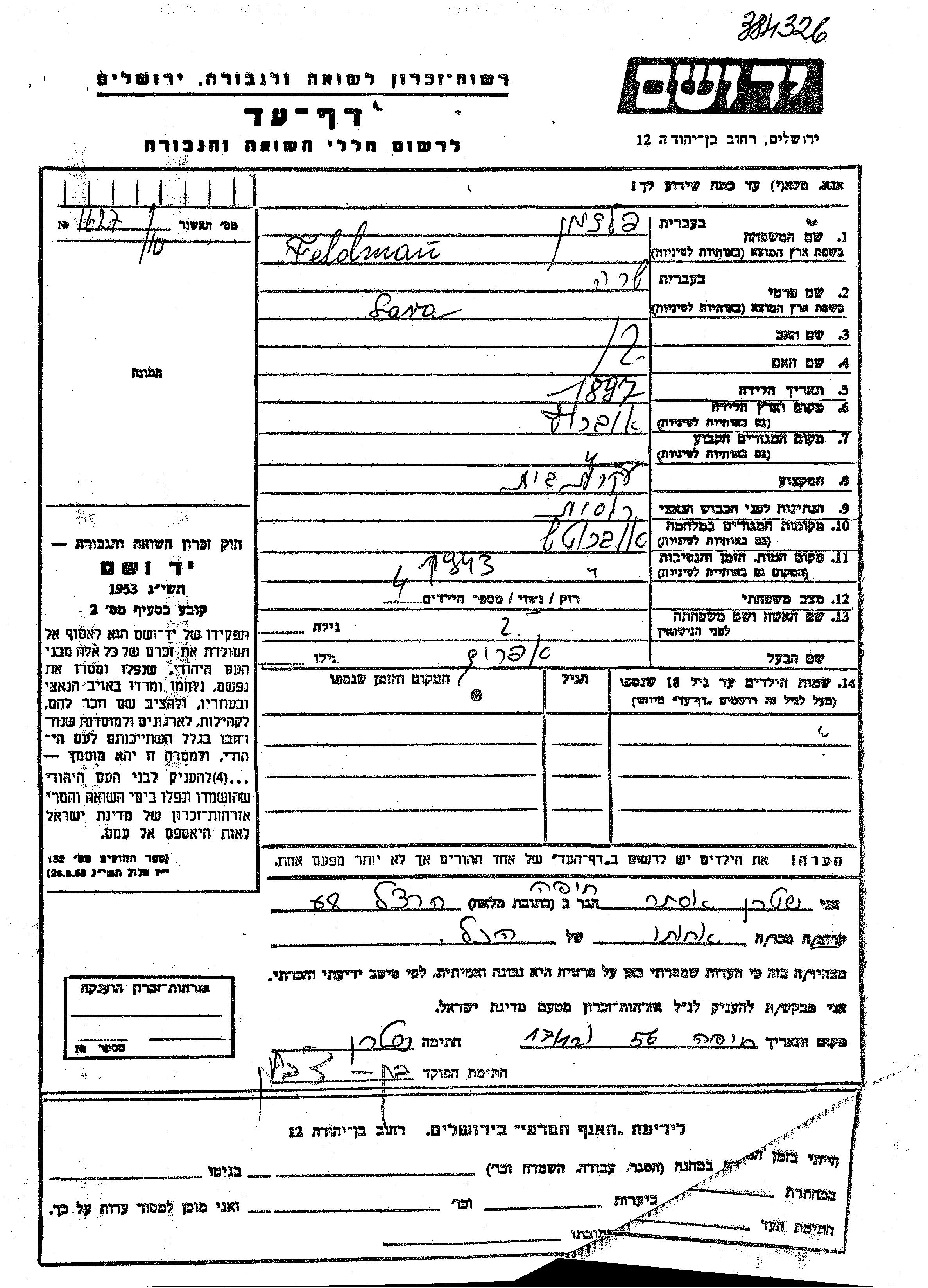 Feldman Sara 1897 Ovruch, Ukraine (USSR) Page of Testimony