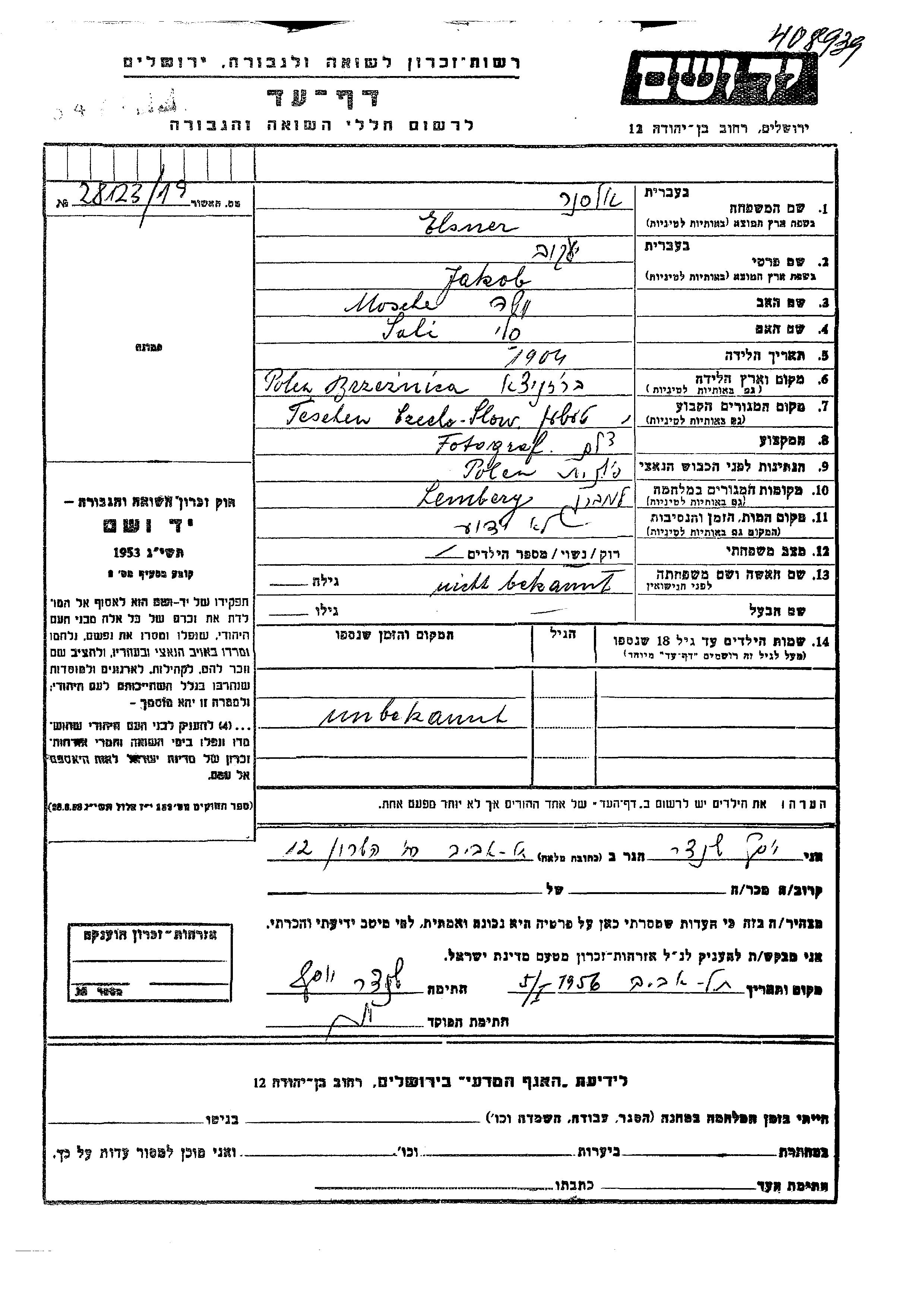 Jakob Elsner was born in Brzeznica, Poland, 1904 to Mosche and Sali. He was a photographer and married. Prior to WWII he lived in Teschen, Czechoslovakia. During the war he was in Lemberg, Poland. Jakob was murdered in the Shoah.