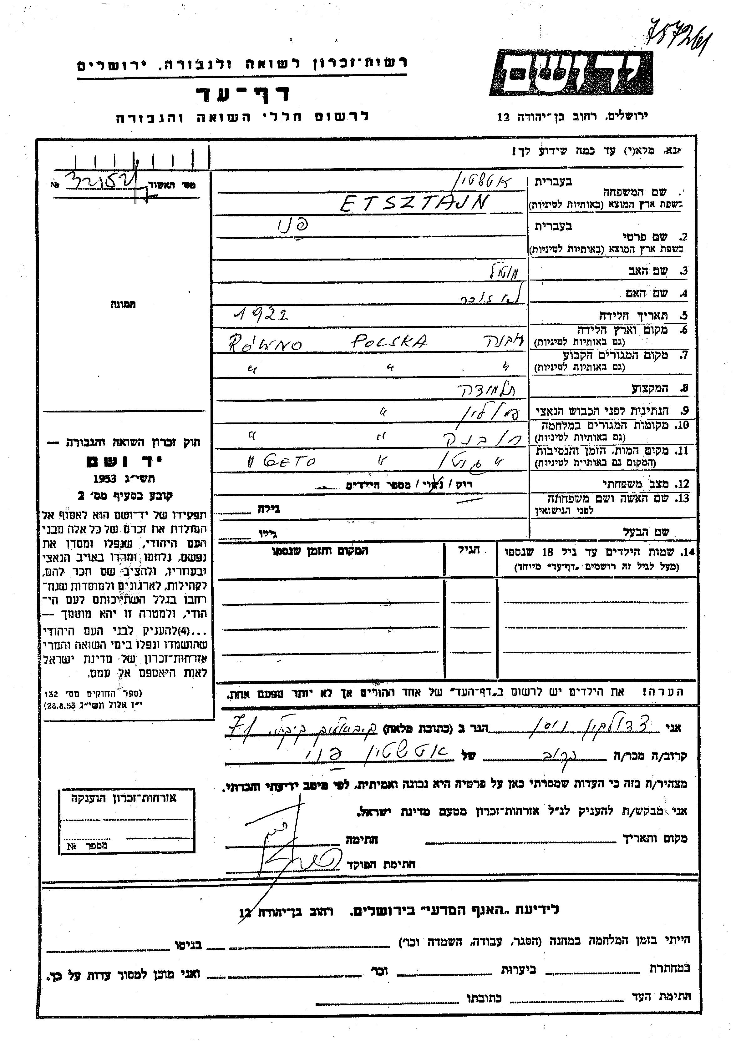 Fani Etsztajn was born in Rowno, Poland, 1922 to Motil. She was a pupil and single. Prior to WWII she lived in Rowno, Poland. During the war she was in Rowno, Poland. Fani was murdered in the Shoah. Place of death: Rowno, Poland.