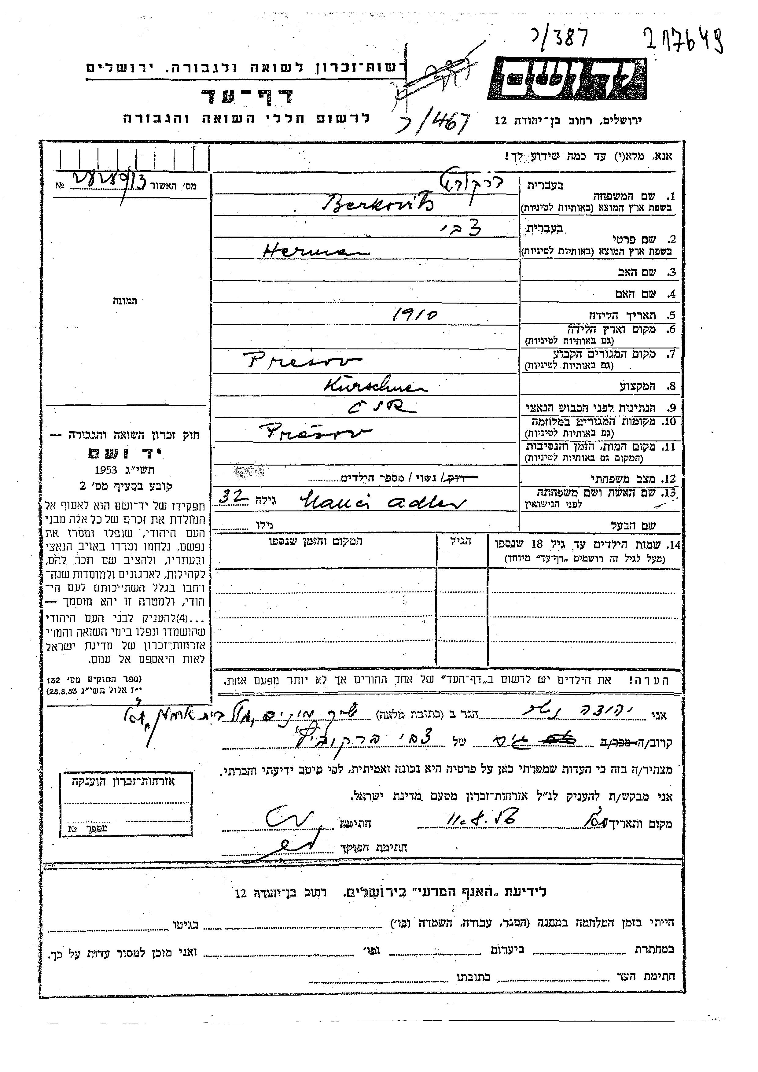 Herman Tzvi Berkovits was born, 1910. He was a fur tailor and married to Manci nee Adler. Prior to WWII he lived in Presov, Czechoslovakia. During the war he was in Presov, Czechoslovakia. Herman Tzvi was murdered in the Shoah.